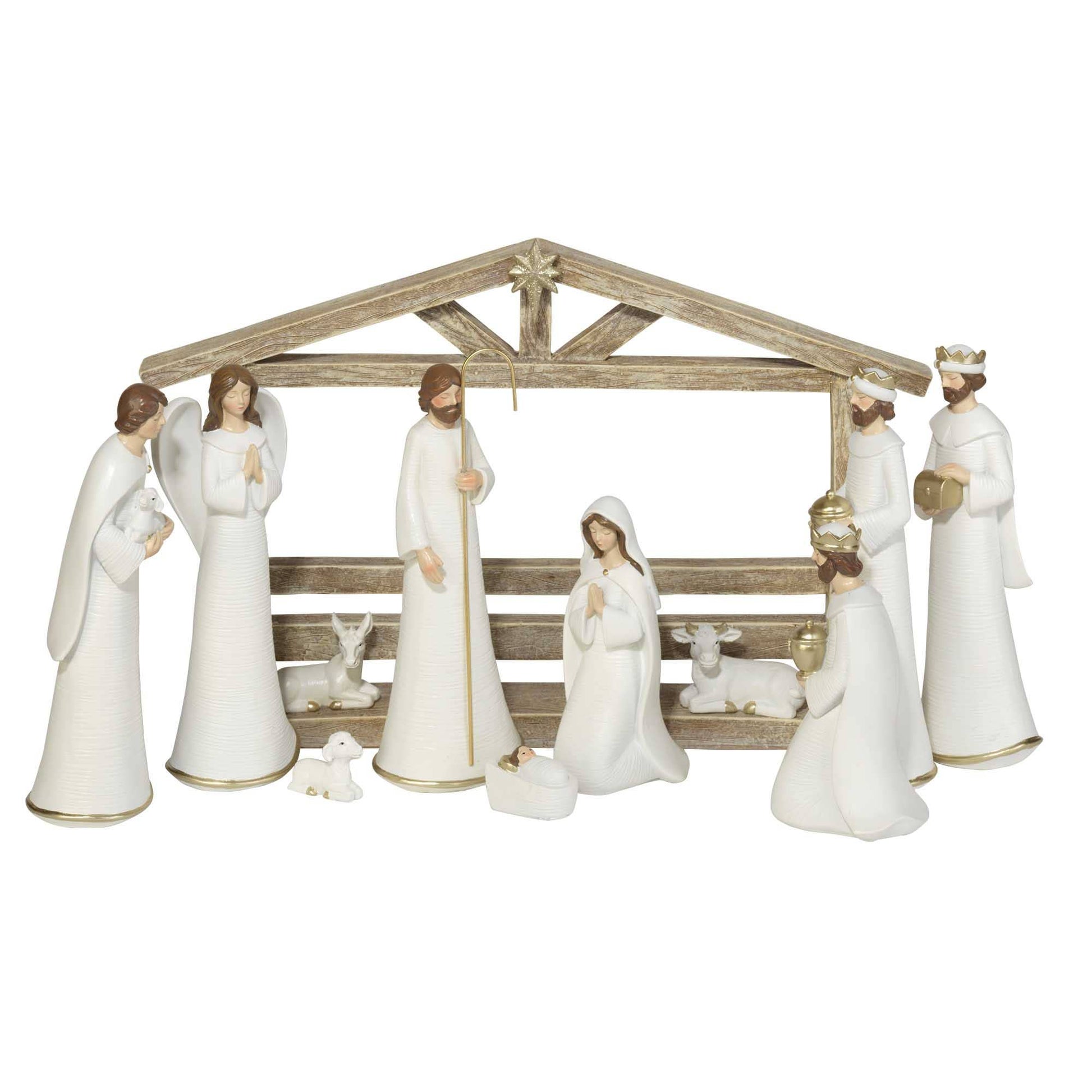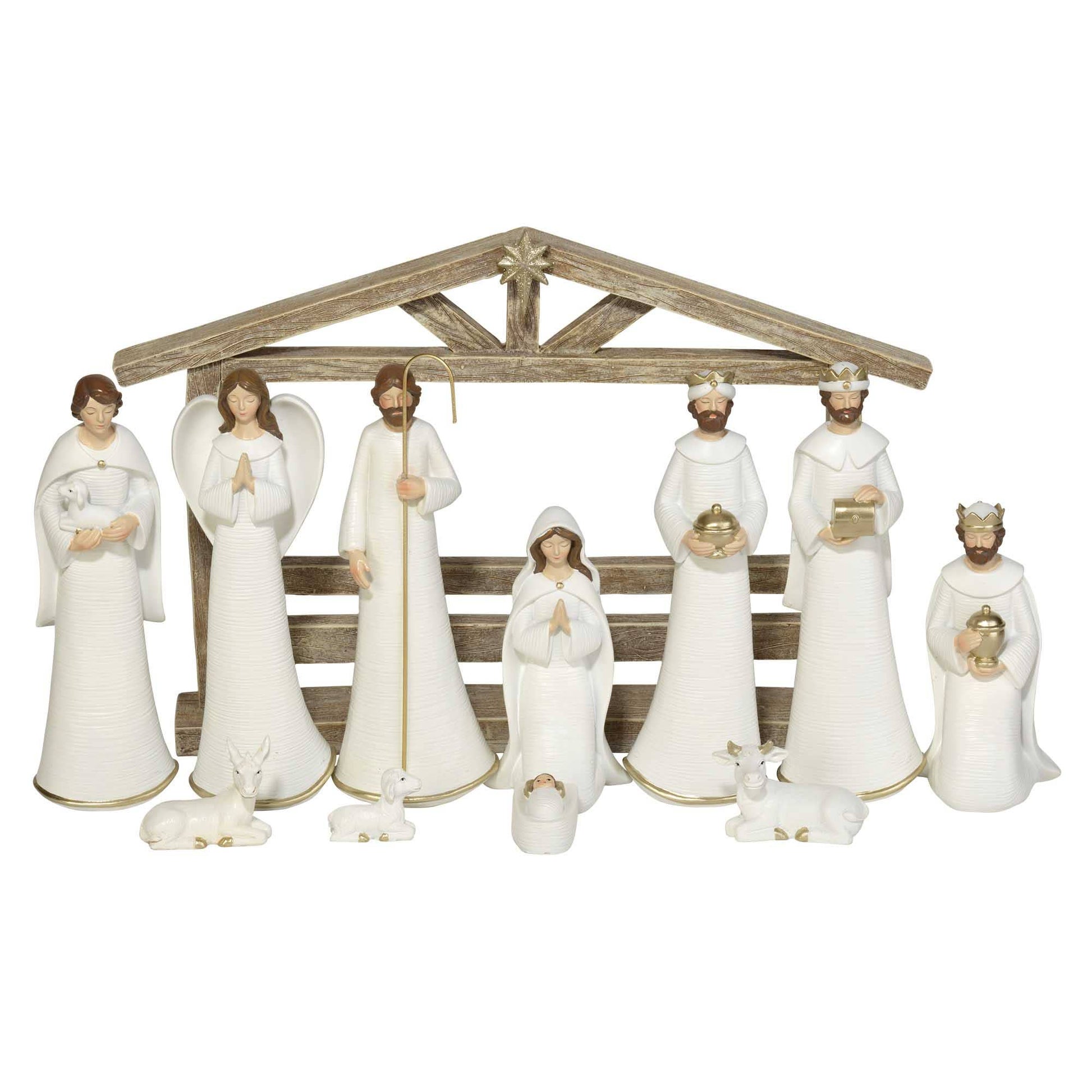 Beautiful 11-figure white nativity set includes a rustic style creche with glittered star. Figures have lovely hair and face details; robes are accented with muted gold stripe at hem; Wise Men's crowns and gifts are also a muted gold tone.
