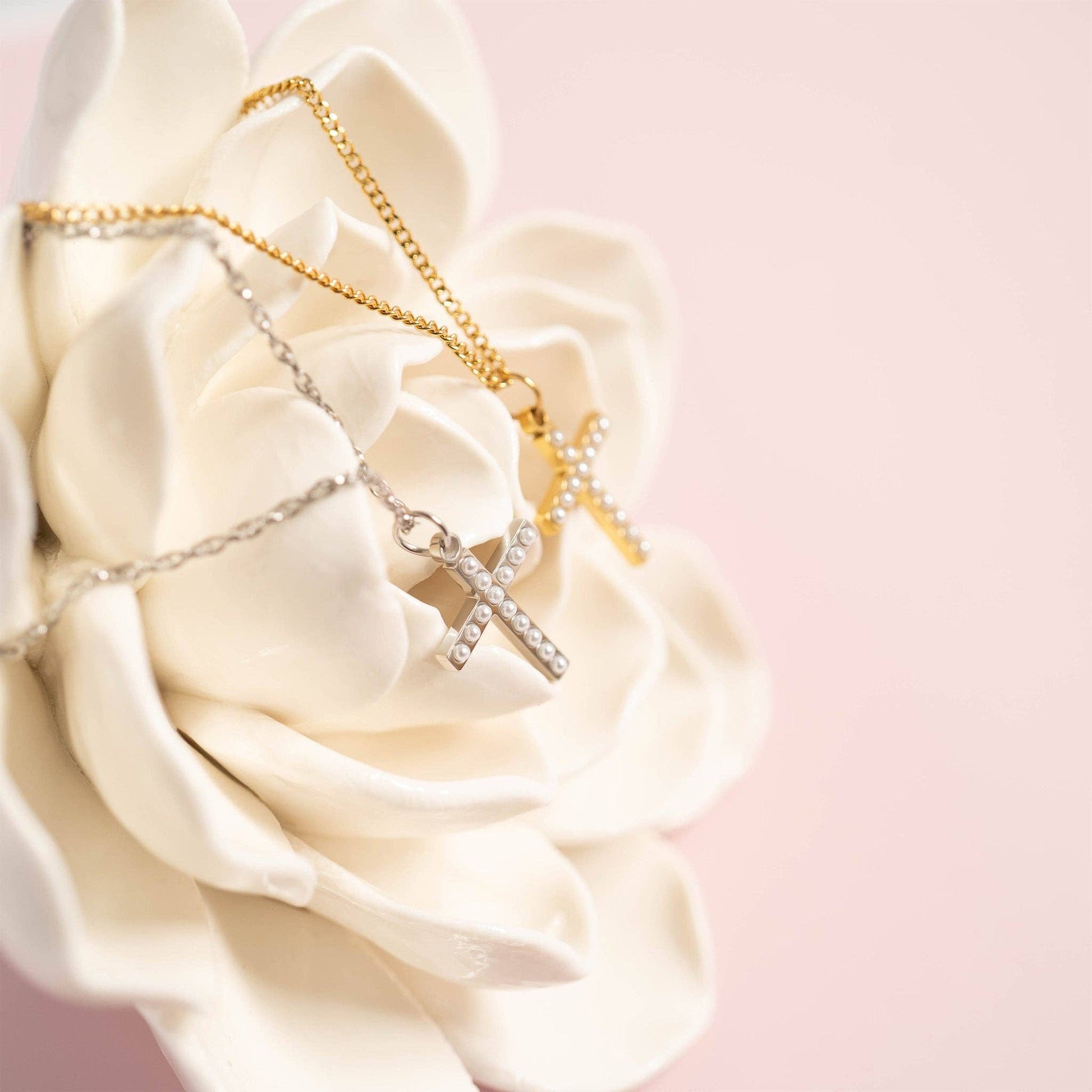 18K Gold PVD Stainless Steel Pearl Beaded Cross Charm