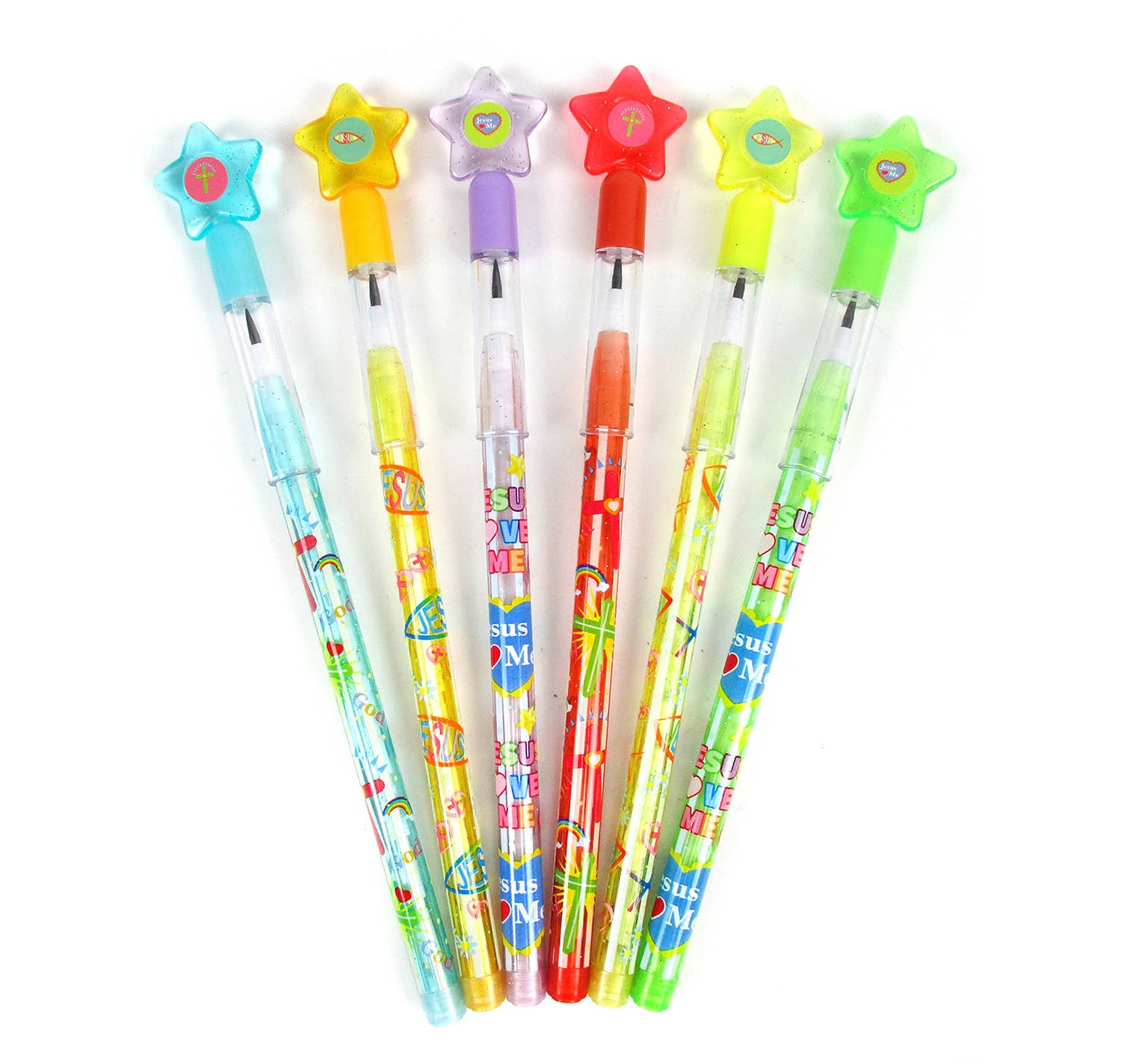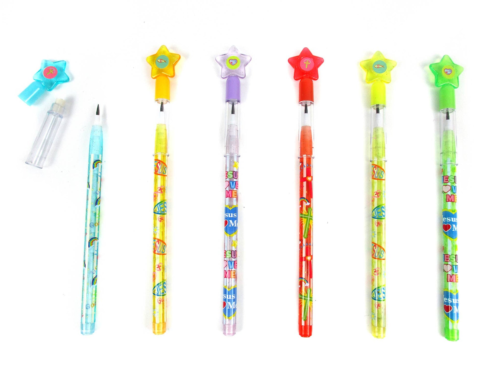 Each set contains 6 stackable point pencils with 11 leads per pencil in a retail ready display box with butterfly hang hole. No need to sharpen pencils anymore with our Christian religious multi-point pencils. Push the used lead on top and a new lead pops out in front. Great stocking stuffer idea.