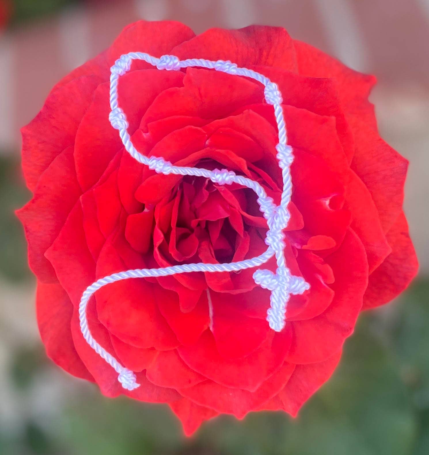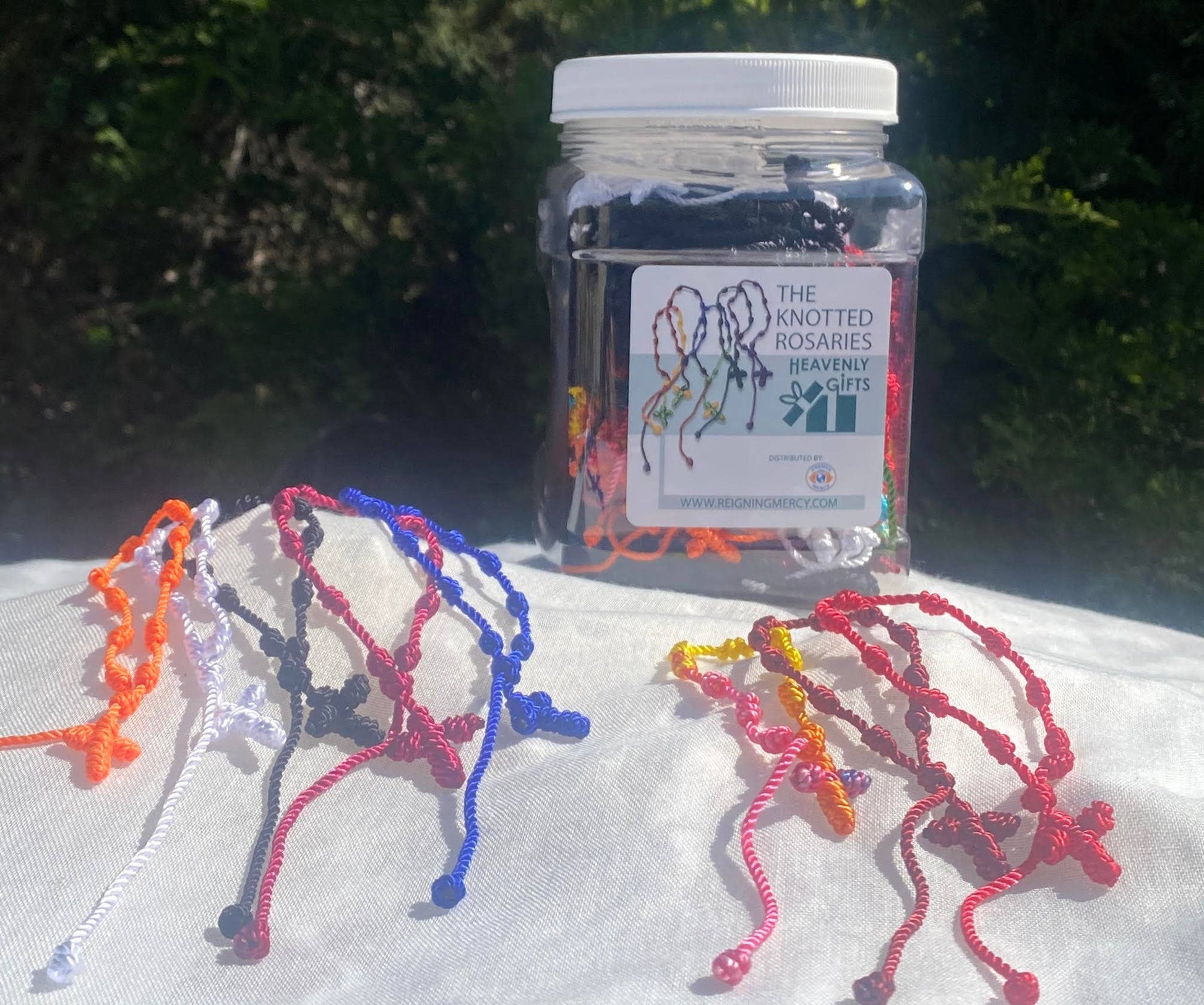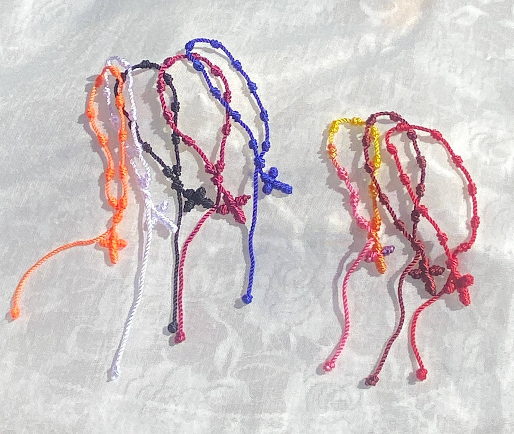 Small colorful hand-tied knotted Chaplets made in Puebla Mexico by a group of senior citizens.