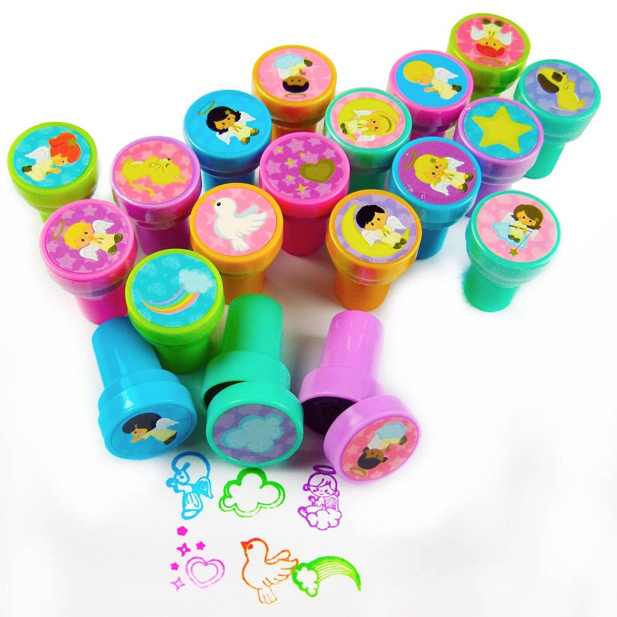 Our angel stamper set comes in 24 different angel boys and angel girls' designs. These stamps are great for sunday school, vacation bible school, church festivals, and Christmas or simply just arts & crafts at home. These stampers are perfect for create your own greeting cards, scrapbooking, and decorating stationery. All 24 pcs are a different design, there are no repeats. Our stamps are non-toxic, lead-free have passed all CPSIA and ASTM testing. Safe for children to use. 1.5 inches tall, 1 inch in diameter.
