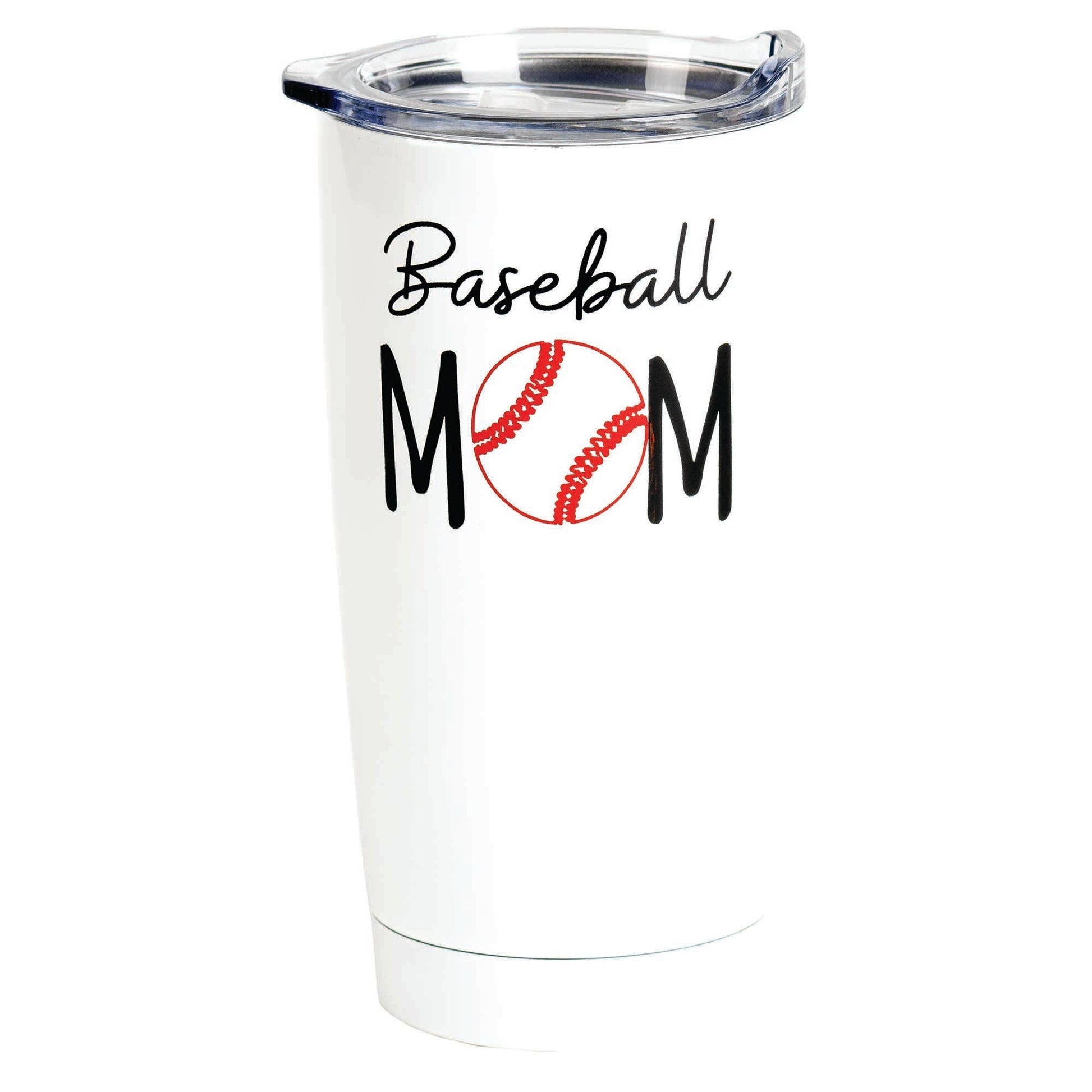 Baseball Mom Stainless Steel 20 oz Travel Mug The perfect travel companion for every sports mom, this travel mug is stainless steel inside and out, finished in white, with a Baseball Mom design. Holds 20 ounces; clear heavy duty plastic lid has sealing ring and sliding drink opening cover to help prevent spills. To care for mug, hand wash only and do not microwave.