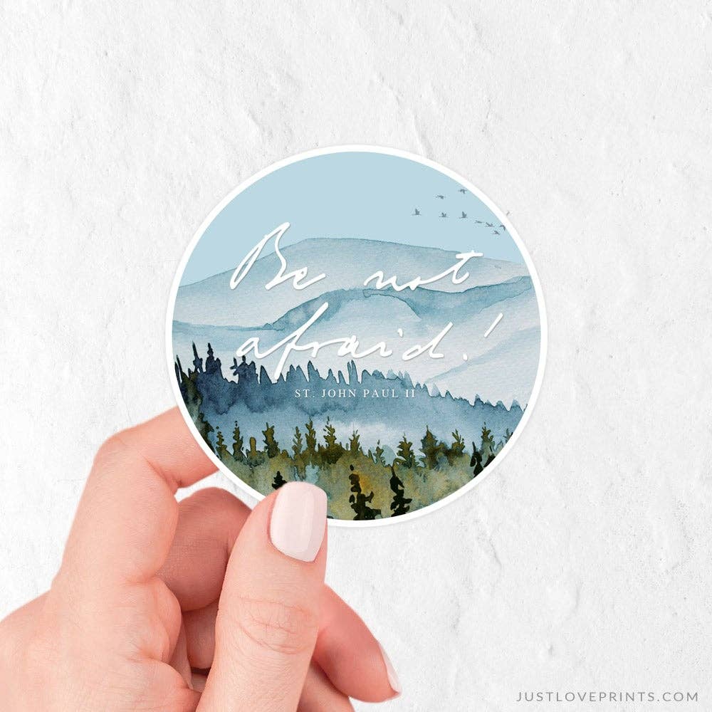 "Be not afraid!" These words were spoken by St. John Paul II, and the text in the design is written in his actual handwriting! Put these waterproof vinyl stickers on your water bottle, laptop, phone, notebooks, or car!