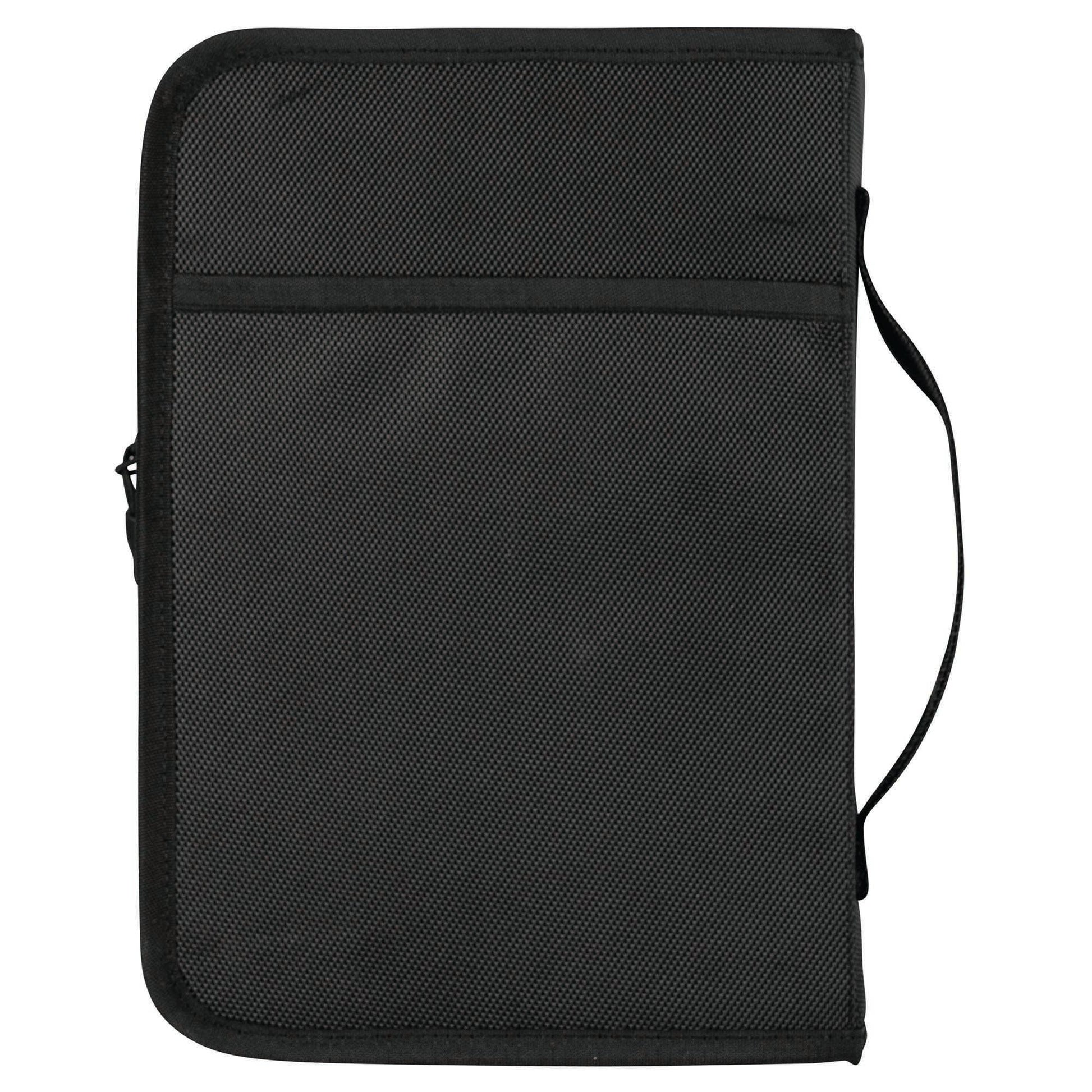 Portfolio style Bible cover is made of rugged polyester ballistic fabric that's very durable and water resistant, with nylon reinforced stitching. Hardboard sides give it a briefcase appearance and provide extra protection. Open pocket on back and three pockets on front: two are 3" x 4" with flaps and velcro fasteners; great for coins, keys etc. One is 5" x 6" with zipper closing; perfect for smaller phone or a wallet. Front of pocket has silver metal cross accent. Zipper around side is two-way and finished with spoon style cross pulls. It's also non-rusting and self-repairing. Side carrying handle. Lay flat construction allows easy reading and study. There's also a pen loop and attached ribbon bookmark inside. The Large size will hold a Bible or book up to about 6 3/4" x 9 1/2" x 2".