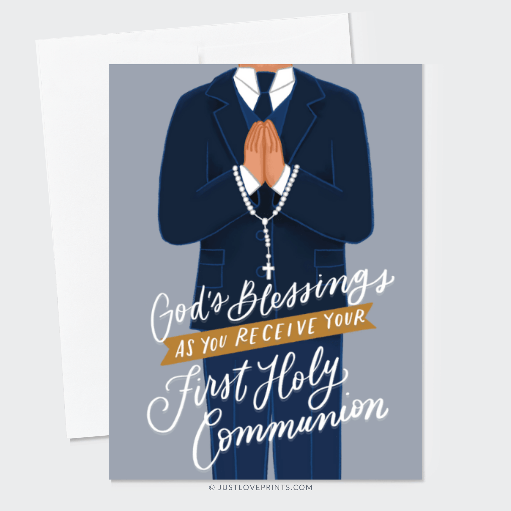 This is a First Holy Communion card that any little boy will want to keep in his memory box forever! Share this special greeting card with any boy communicant, and help him to celebrate his special day.