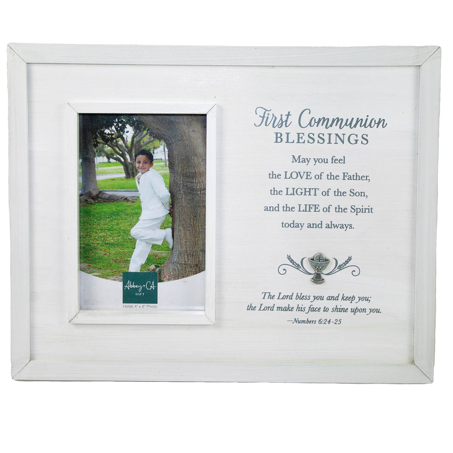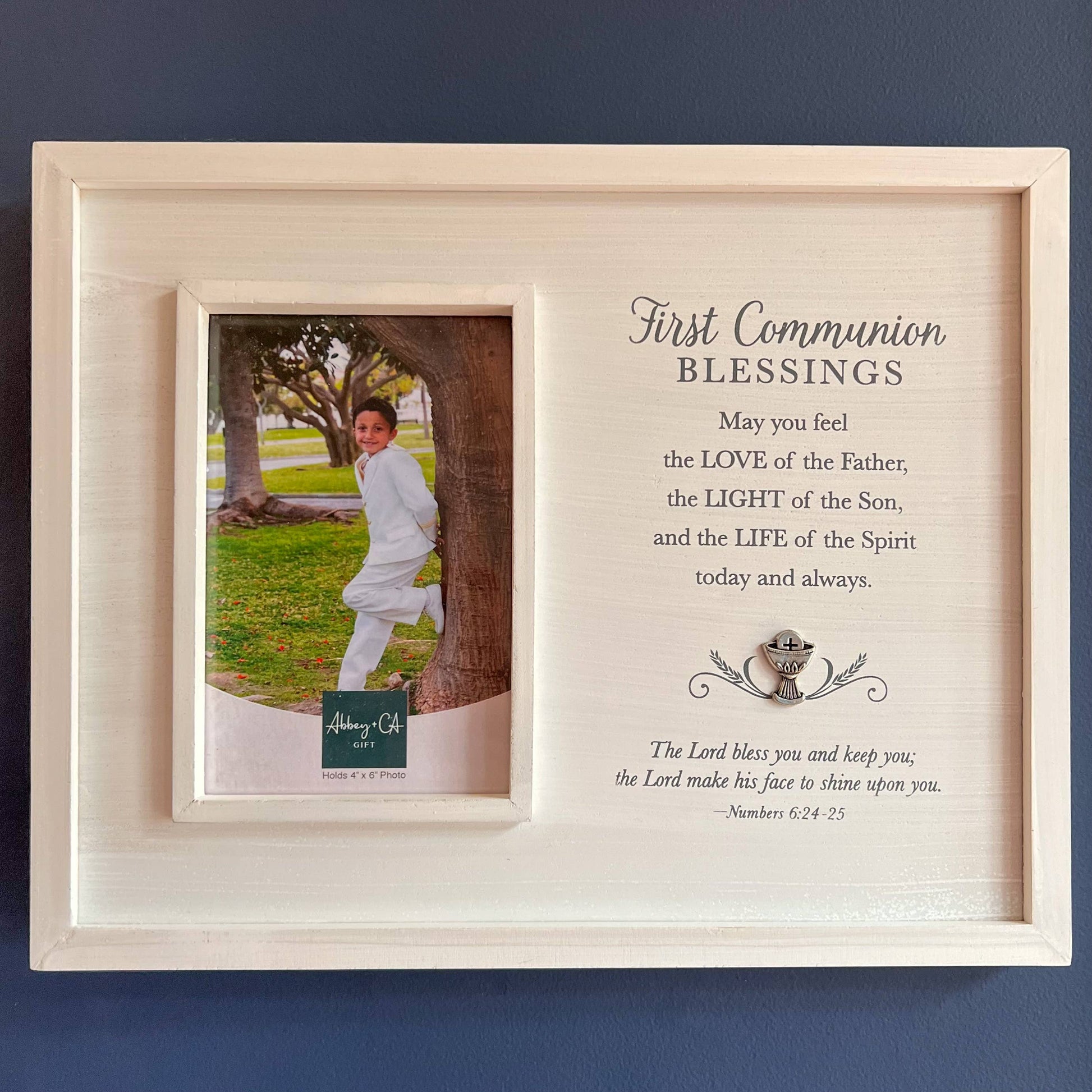 Composite Material communion frame, whitewashed rustic finish, metal chalice accent, holds 4" x 6" photo, "may you feel the love…."Hangs or stands, boxed.