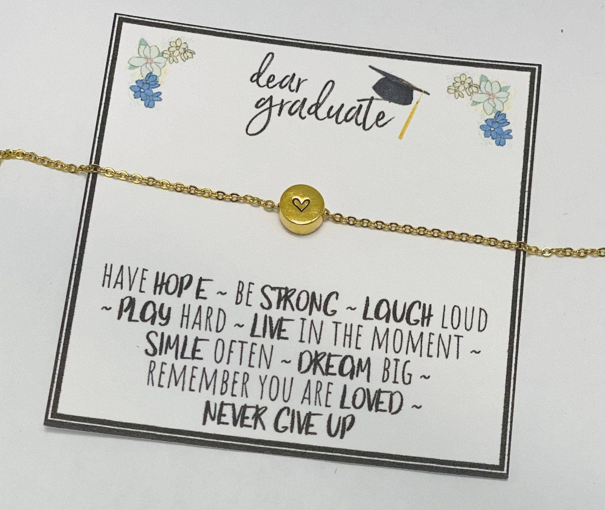Crafted in gold, this grad gift features a hand stamped heart on an 18" chain. Necklace closes with a lobster clasp.