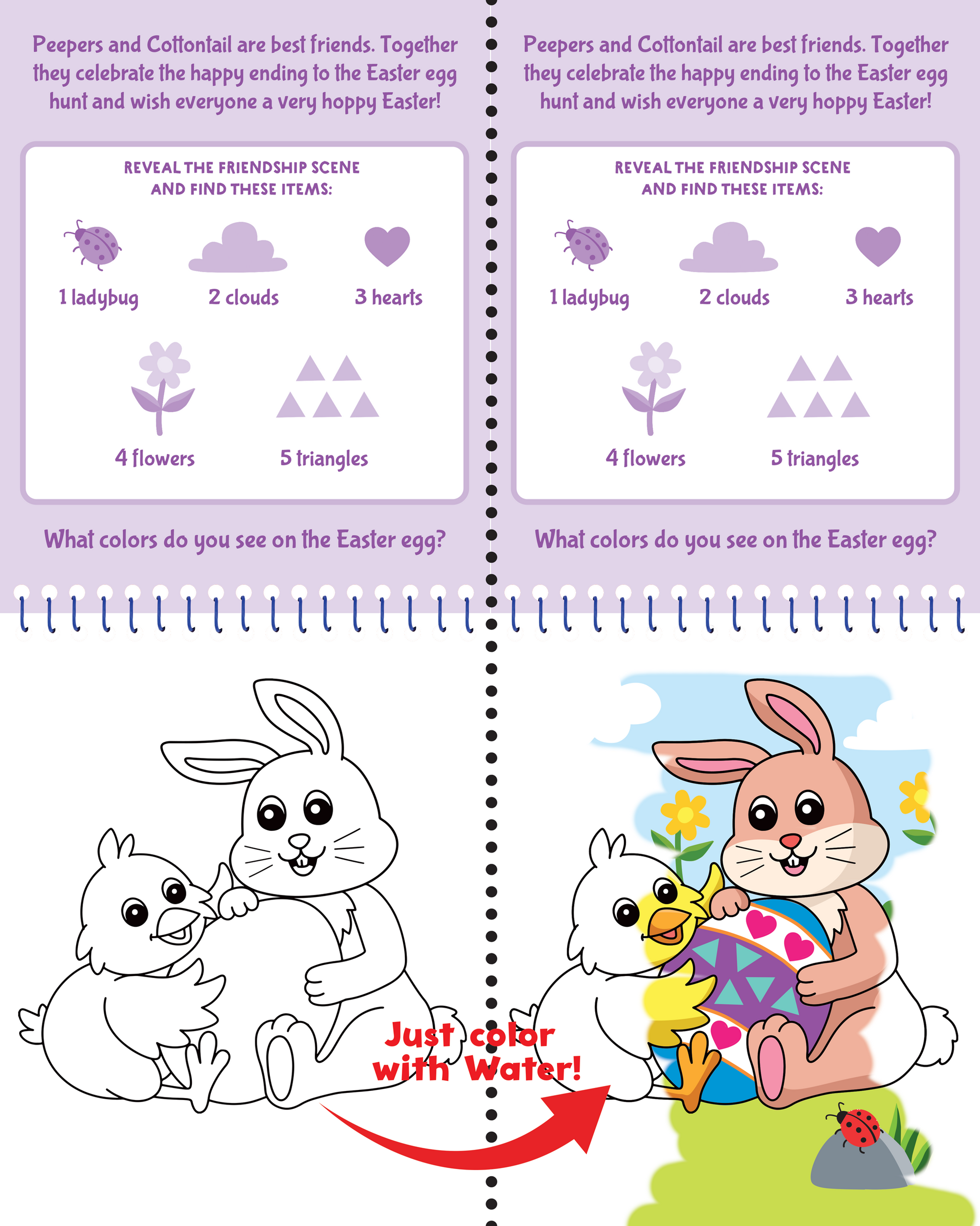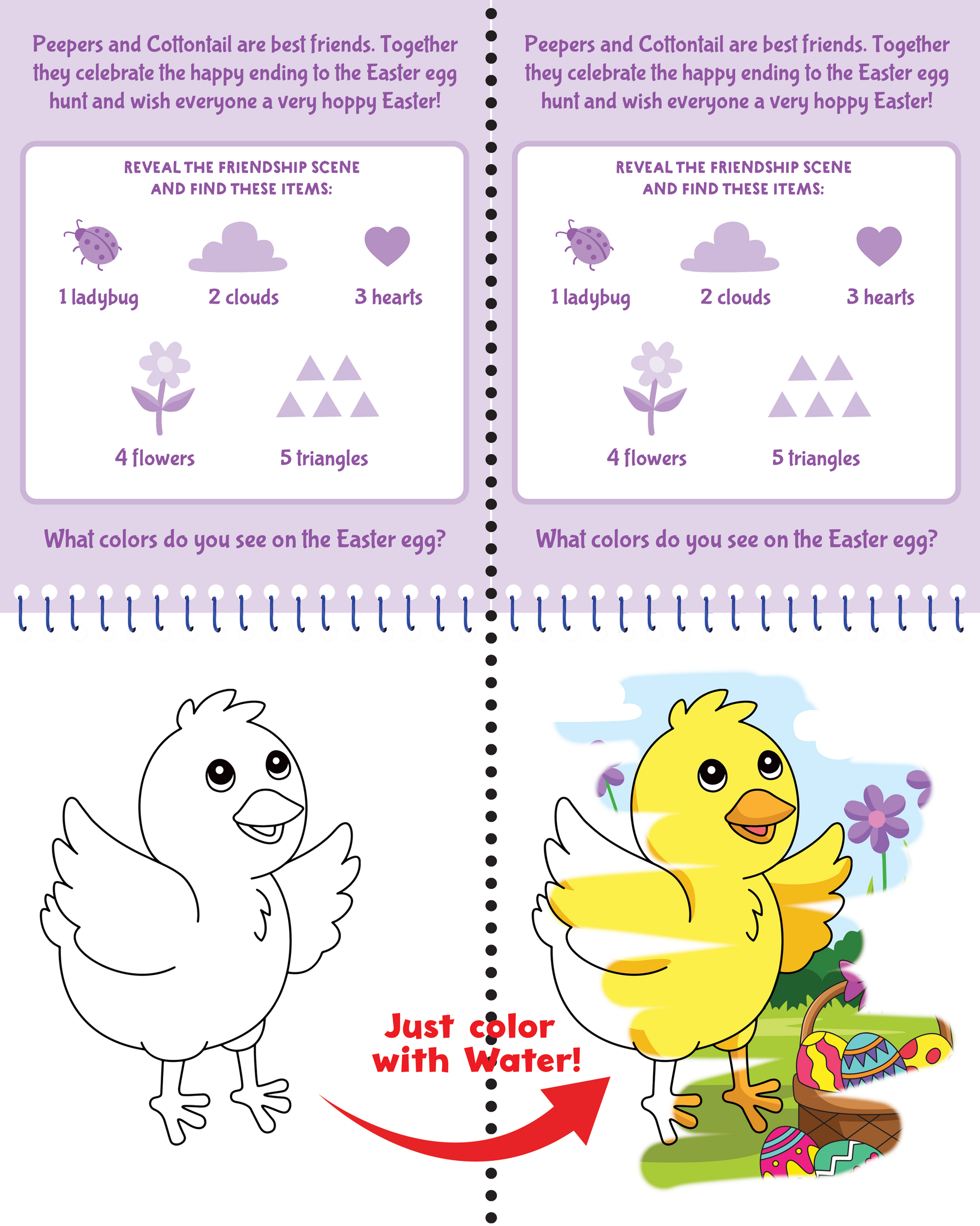It's Easter fun with water art! This no-mess art and seek-and-find activity will delight kids and parents alike! How it works: Simply use the water pen included to brush each scene with water and watch as colors and hidden objects appear like magic! Easy and fun: Remove water pen. Unscrew pen and fill its base with water. Screw on cap. Press pen down gently to wet the tip. Brush each scene with wet pen tip to make colors and hidden items appear! When the picture dries, the colors disappear. Simply brush again with water to make the colors return! When finished, empty the pen and store in its case. Fun at home or on the go! Comes with 4 reusable Easter scene boards and refillable water brush pen with built-in case! Ages 3 and up. Art activity set measures 6'' wide x 11'' high.