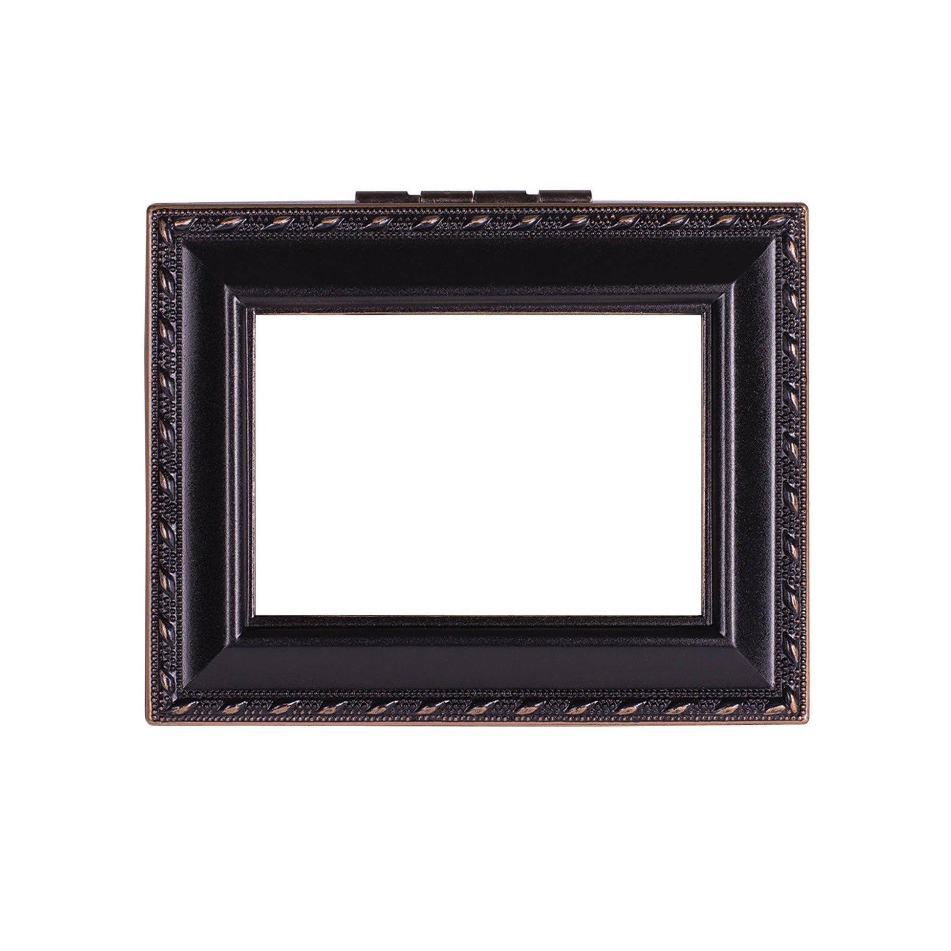 Hinged lid designed with double window frame; embossed rope trim details. Jewelry box measures approximately 6 x 4 x 2.5 inches; Replace artwork with 3 x 5 inch personal photo. Black velvet lined interior cushions your precious treasures; Decorative bun feet are padded to protect table top and shelf surfaces. Traditional wind-up mechanism engages music. Plays: Hallelujah Handel