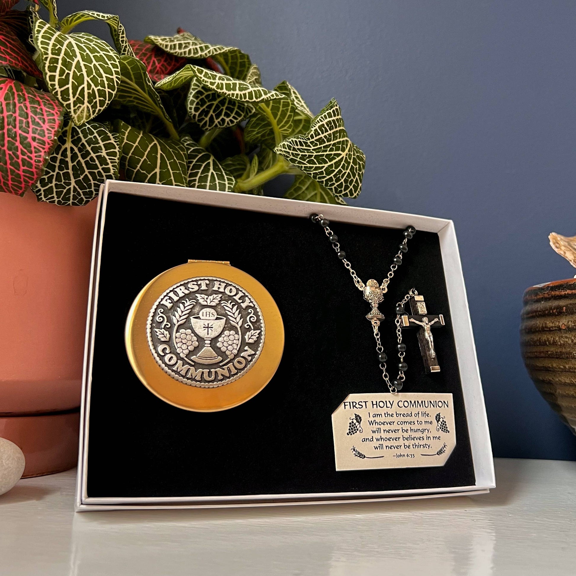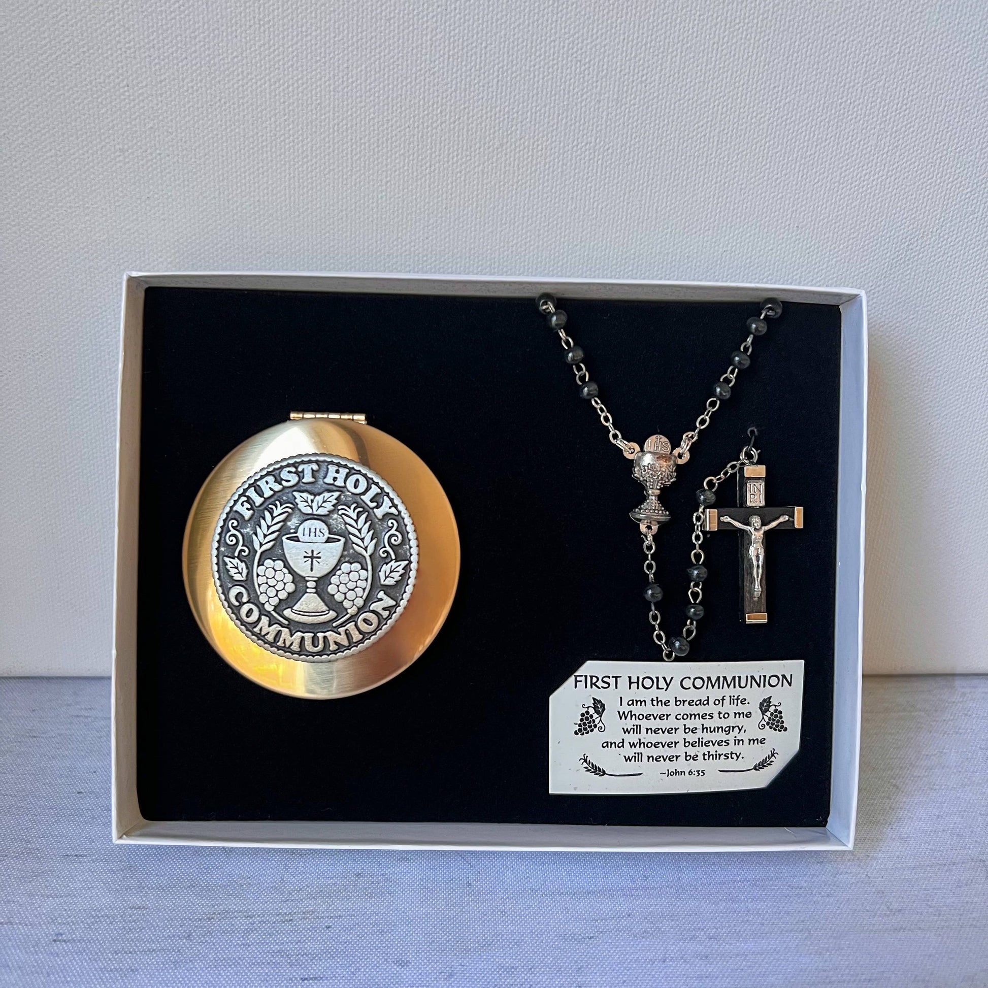 Black wood beaded rosary w/stamped metal hinged communion keepsake box, w/cast chalice design top, window boxed.
