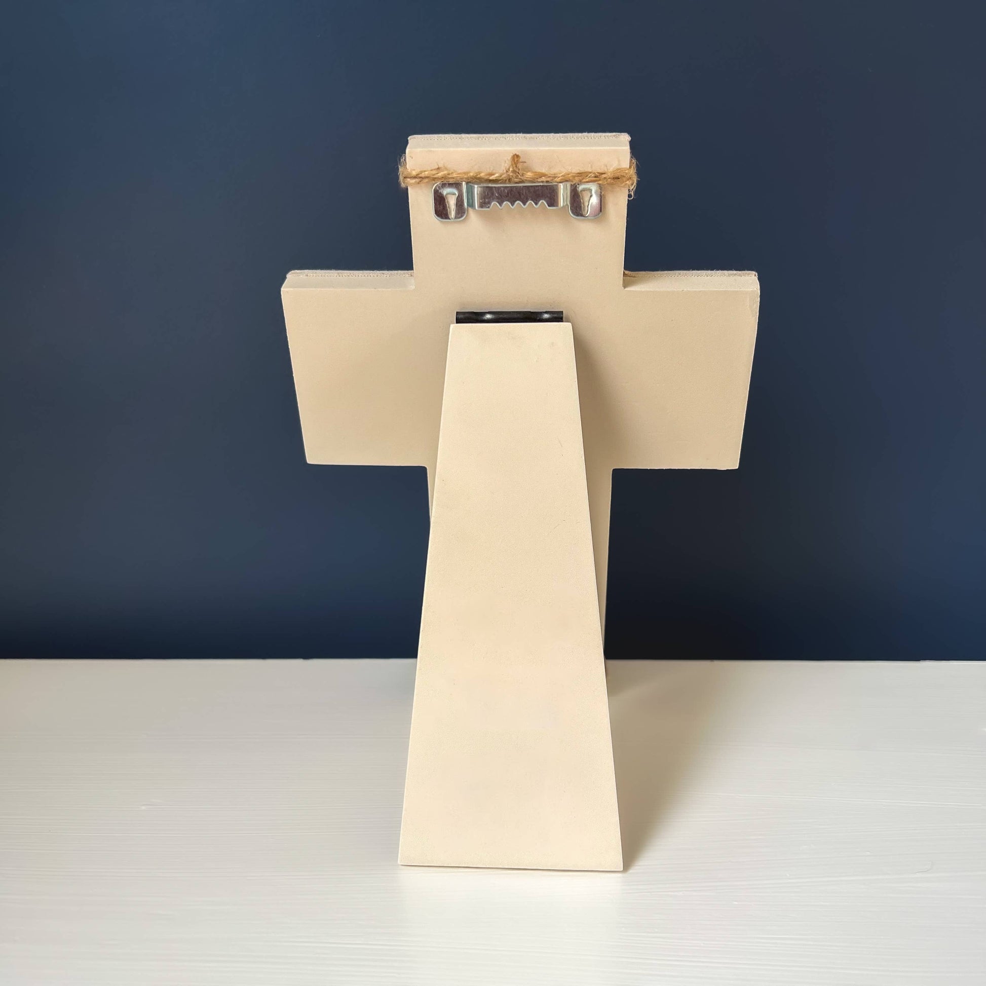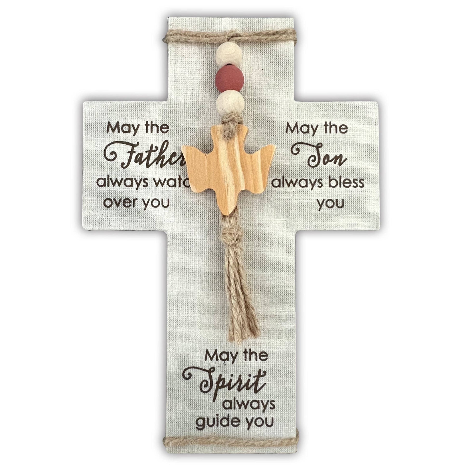 This keepsake cross features the meaningful confirmation blessing “May the Father always watch over you May the Son always bless you May the Spirit always guide you”. Crafted of MDF and wrapped in fabric. Adorned with jute, wood dove charm and beads. Ready to hang or stand with easel back. 5” W x 7 ¼” H. Boxed.