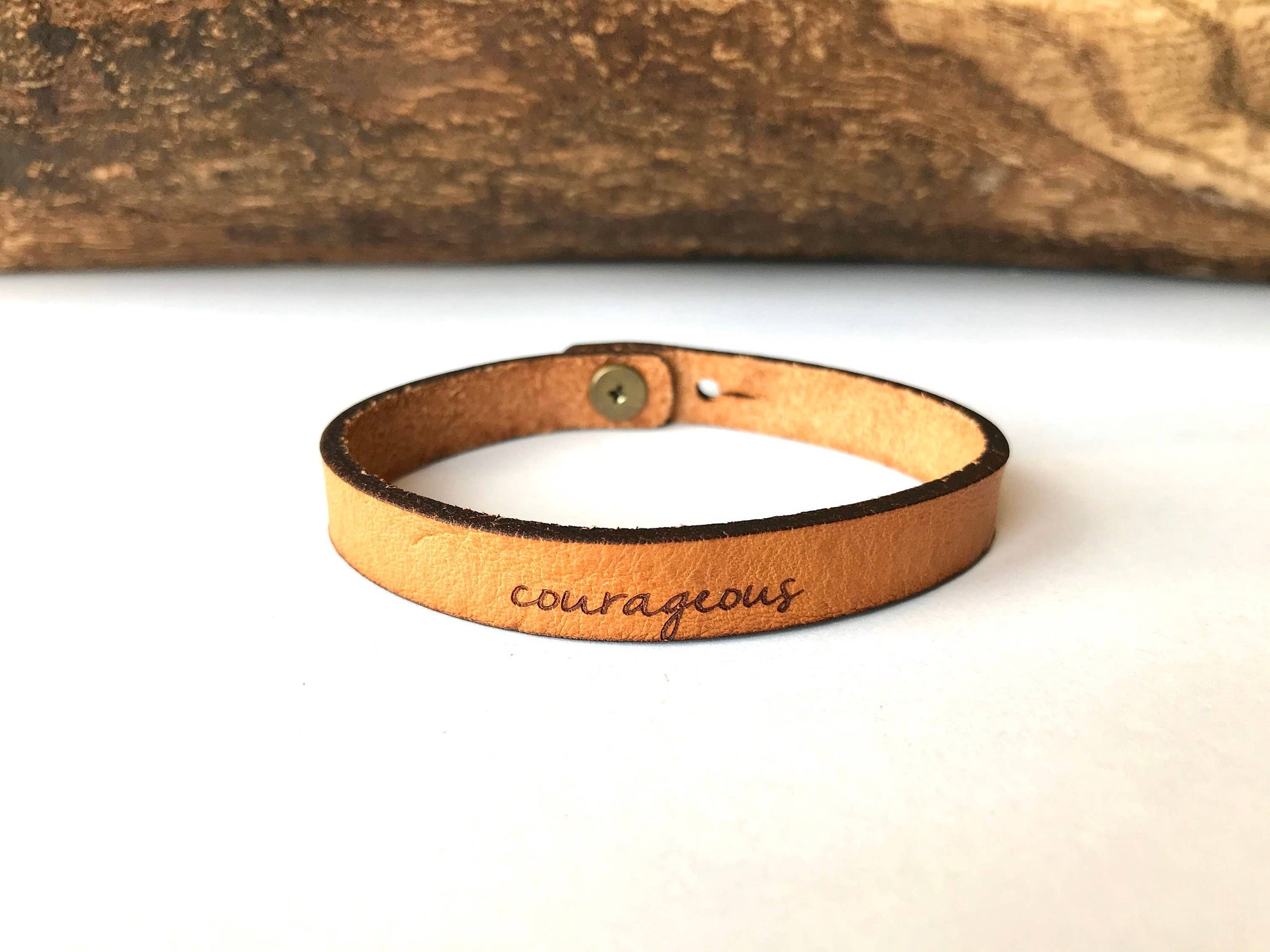 Made from full grain leather from our local leather shop. We personally cut and engrave each bracelet. Closure is a button stud, and adjustable.