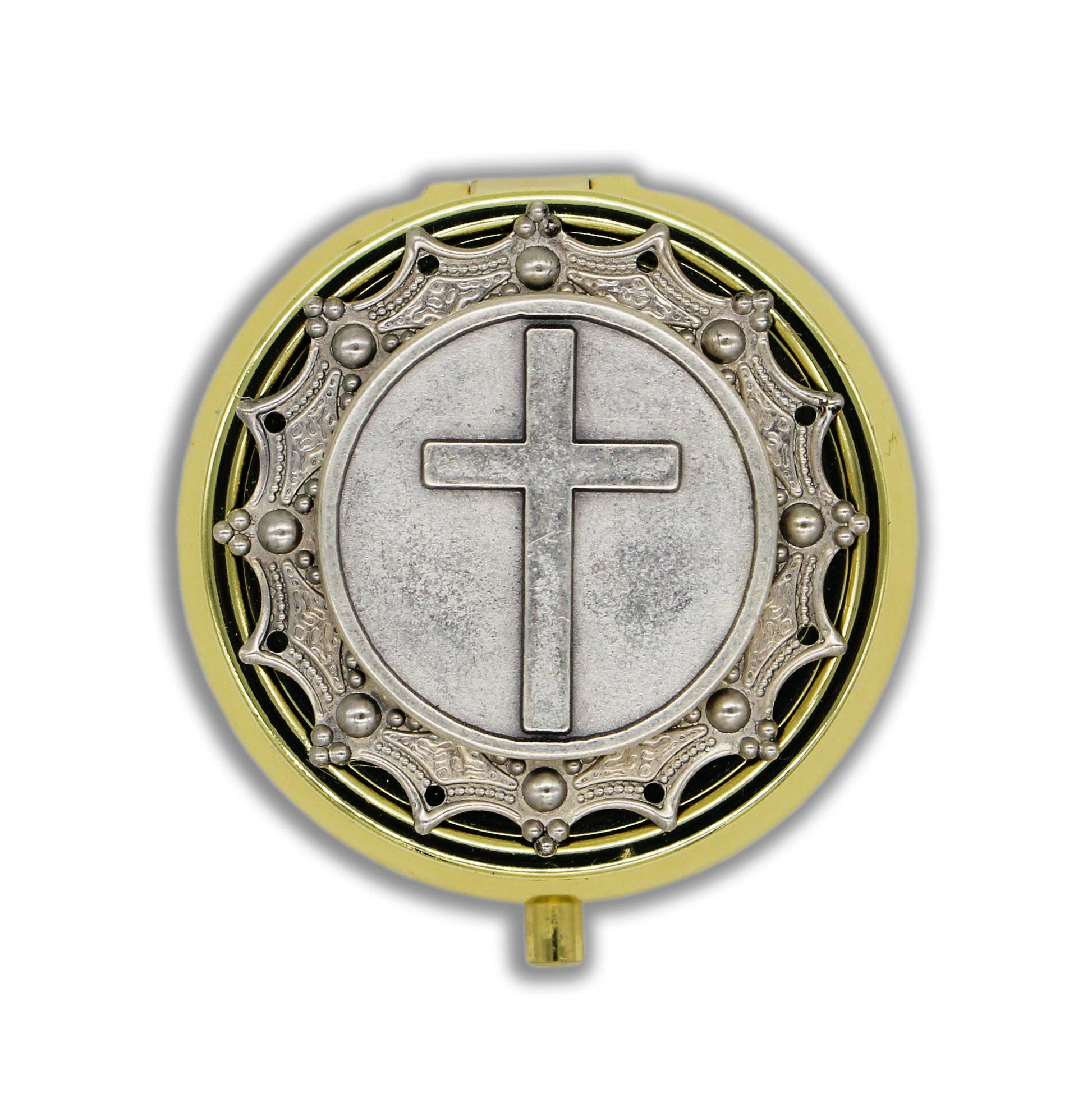 Bronze case, with beautifully decorated filigree iron cast and an image of a PEWTER CROSS.