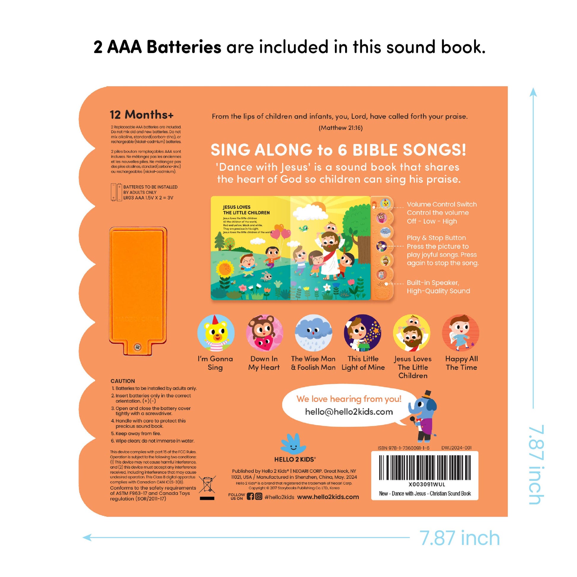 MY CHILD's FIRST BOOK OF PRAISE This is a perfect interactive musical toy for introducing beloved 6 Bible songs with delightful illustrations to encourage your child to praise the Lord from an early age. 1. I'm Gonna Sing 2. Down in My Heart 3. The Wise Man & Foolish Man 4. This Little Light of Mine 5. Jesus Loves The Little Children 6. Happy All The Time ✓ Six kids' favorite bible songs + colorful illustrations, and Interactive song buttons with volume control switch (Off-Low-High) ✓ Play & Stop button: Press the button to play joyful songs. Press again to stop the song. ✓ The built-in speaker provides high-quality sound. ✓ 2 AAA batteries are included in this sound book. ✓ Includes six songs sung by mom & children. ✓ This is a perfect Christian gift for baby showers, baptisms, first communions, Easter, Christmas, and Sunday school events. Kids will enjoy singing along for hours while learning their favorite Bible songs! Parents can also enjoy