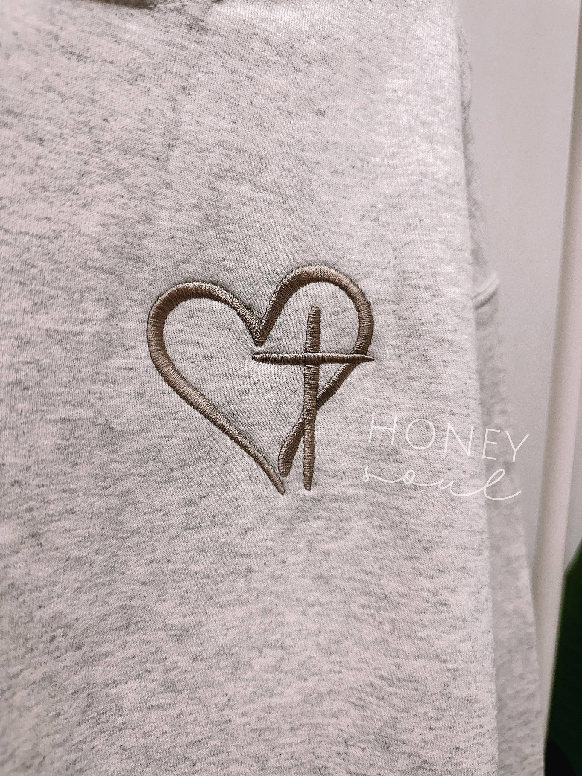 Embroidered Heart & Cross Sweatshirt Sweatshirt color: Oatmeal Heather Sweatshirt Material: 50/50 Cotton/Polyester Sizes: Unisex Small, Medium, Large, XLarge, 2XLarge (see size guides in photos) Thread Color: Beige Embroidery Placement: left of chest