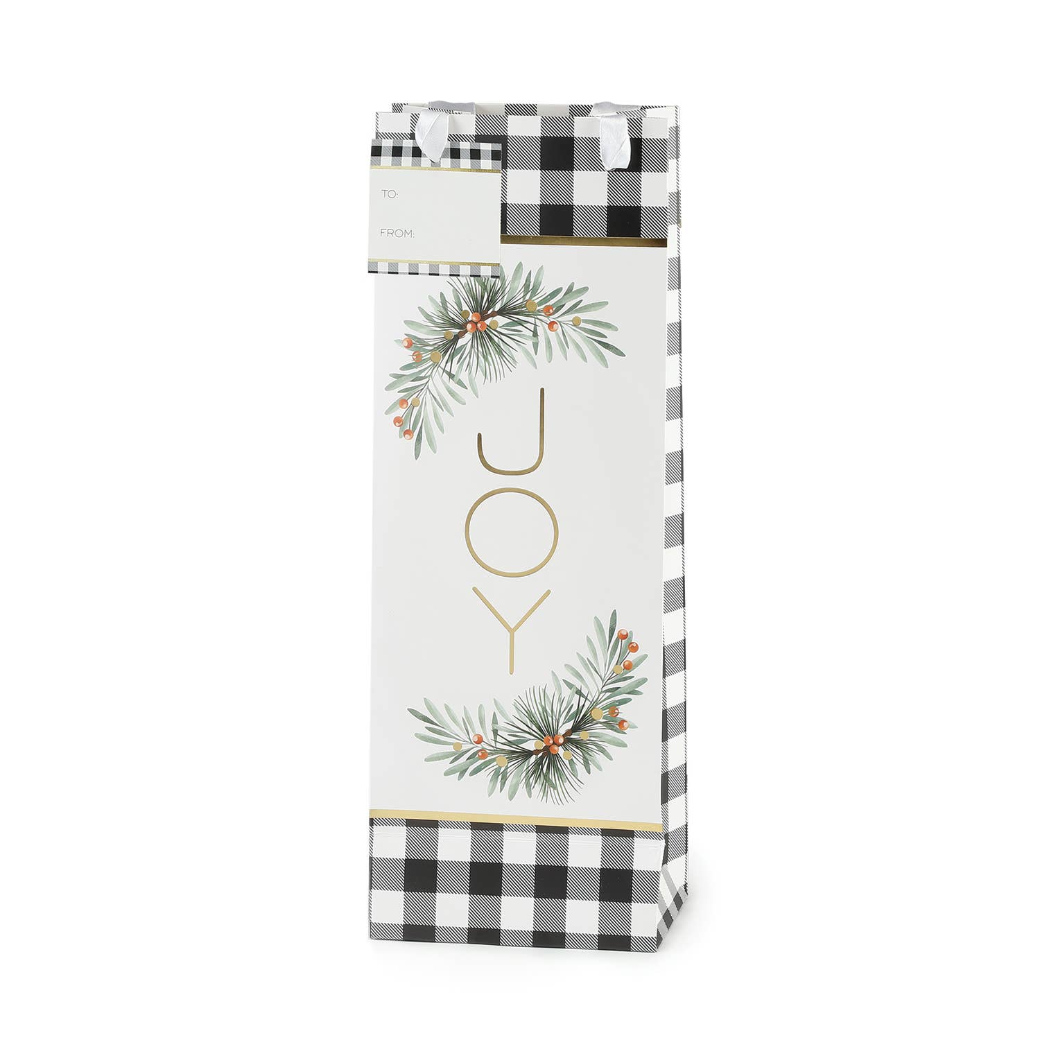 High-quality decorative wine bags perfectly sized for gift giving. Designs feature festive full-color print with gold foil accents. Each bag has an attached gift tag and coordinating ribbon handles for easy carrying.