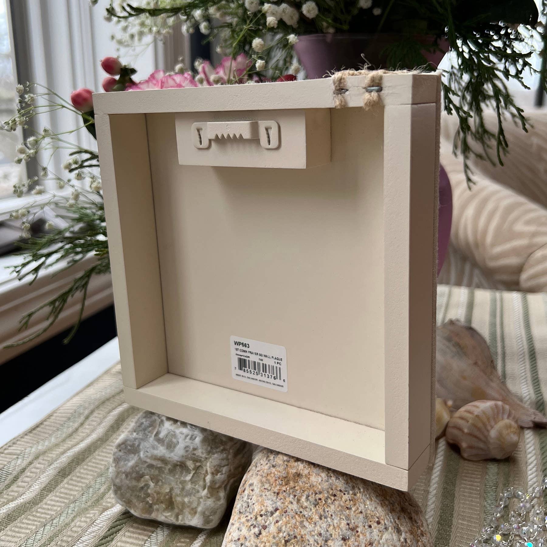 First Communion Prayer Plaque. Fabric covered Composite Material with wood and jute accents. Ready to hang or stand. 6” x 6”. Boxed.