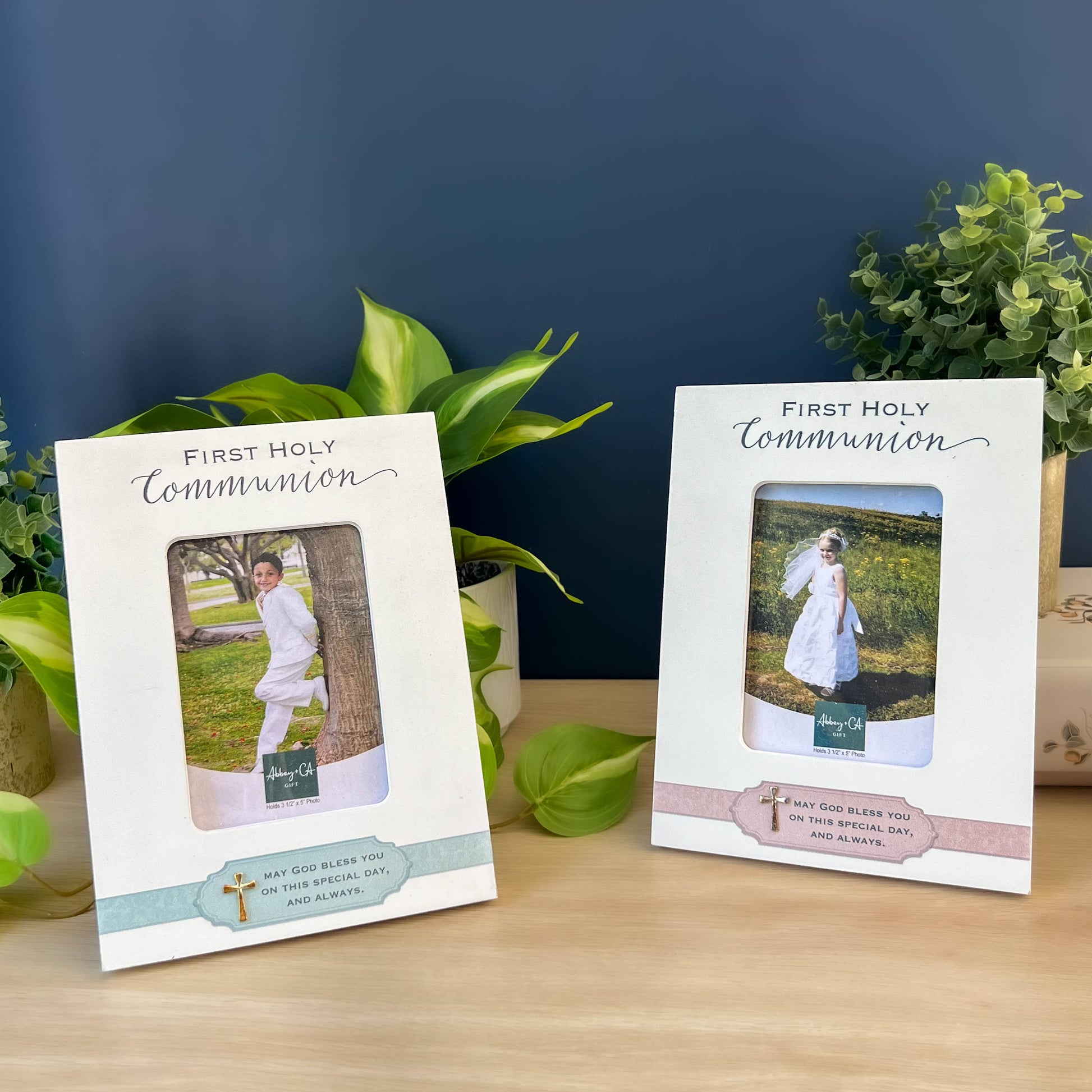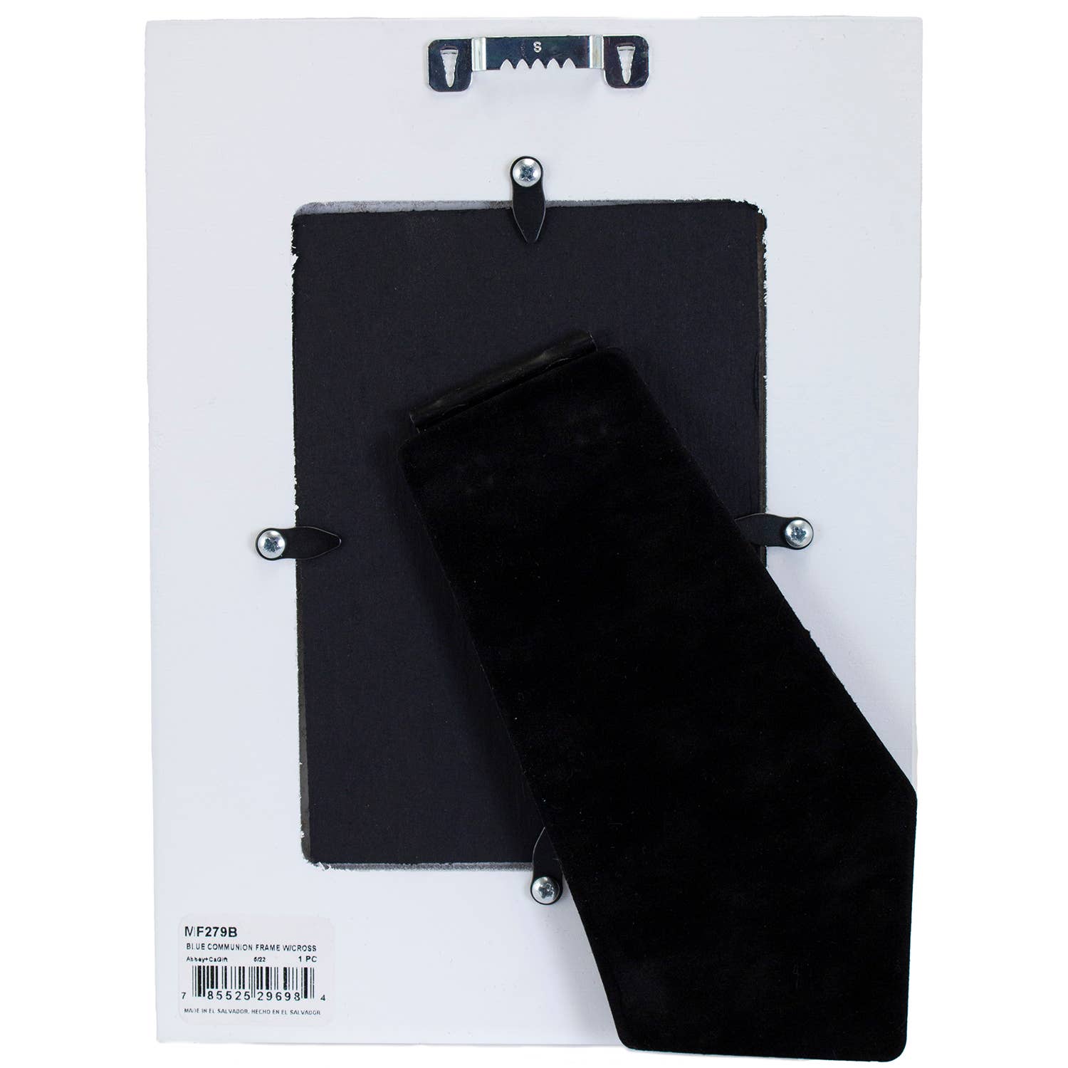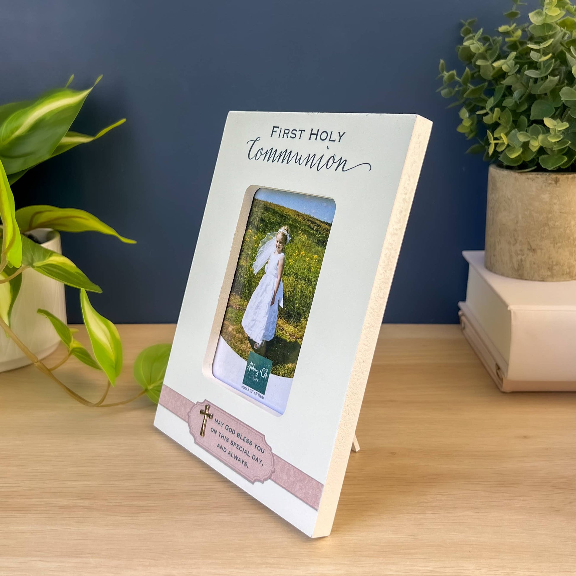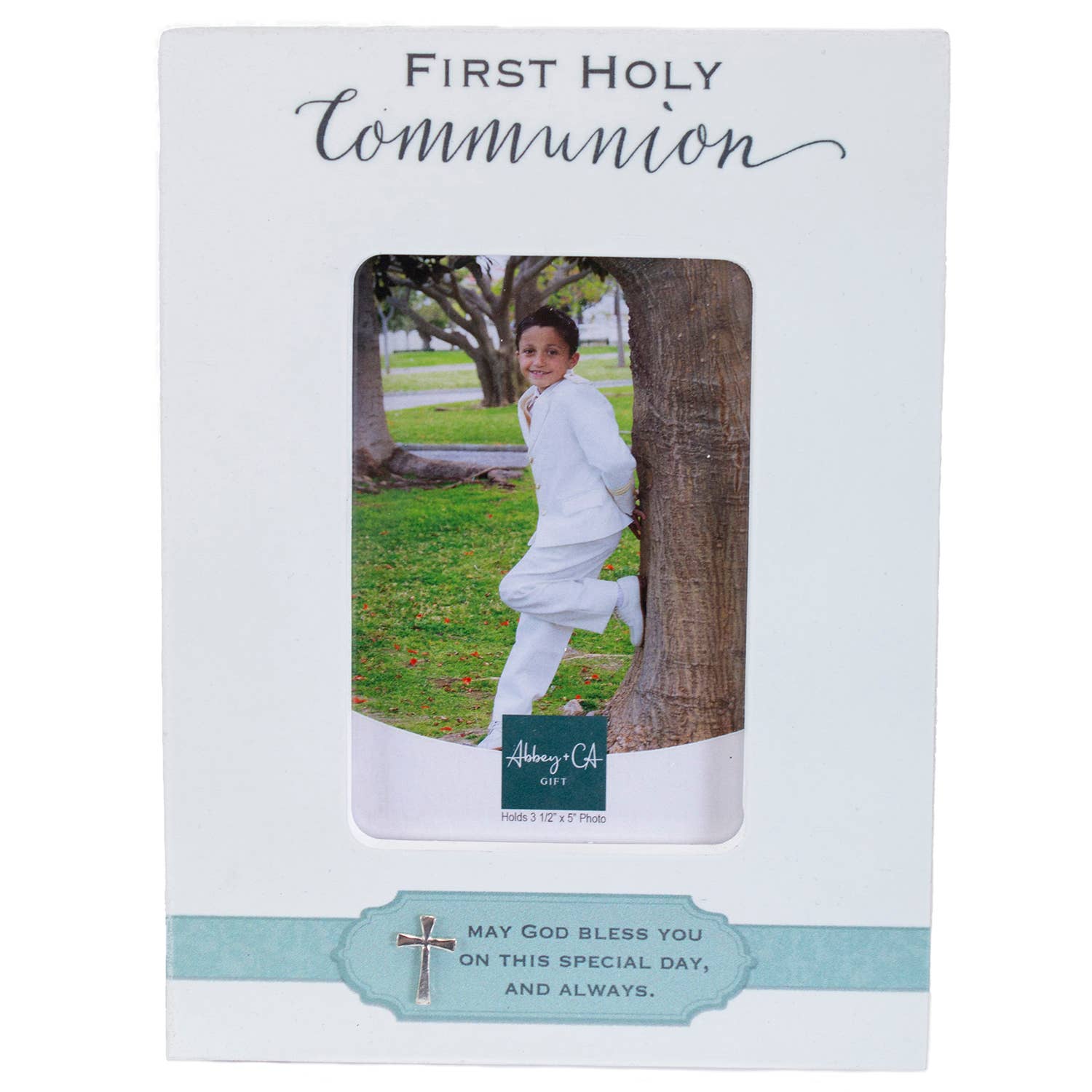 Picture frame with communion blessing, crafted of Composite Material in white with sublimated design, with silver finished metal cross detail. Boxed. Holds 3 ½” x 5"" photo. Hangs or stands with easel back.
