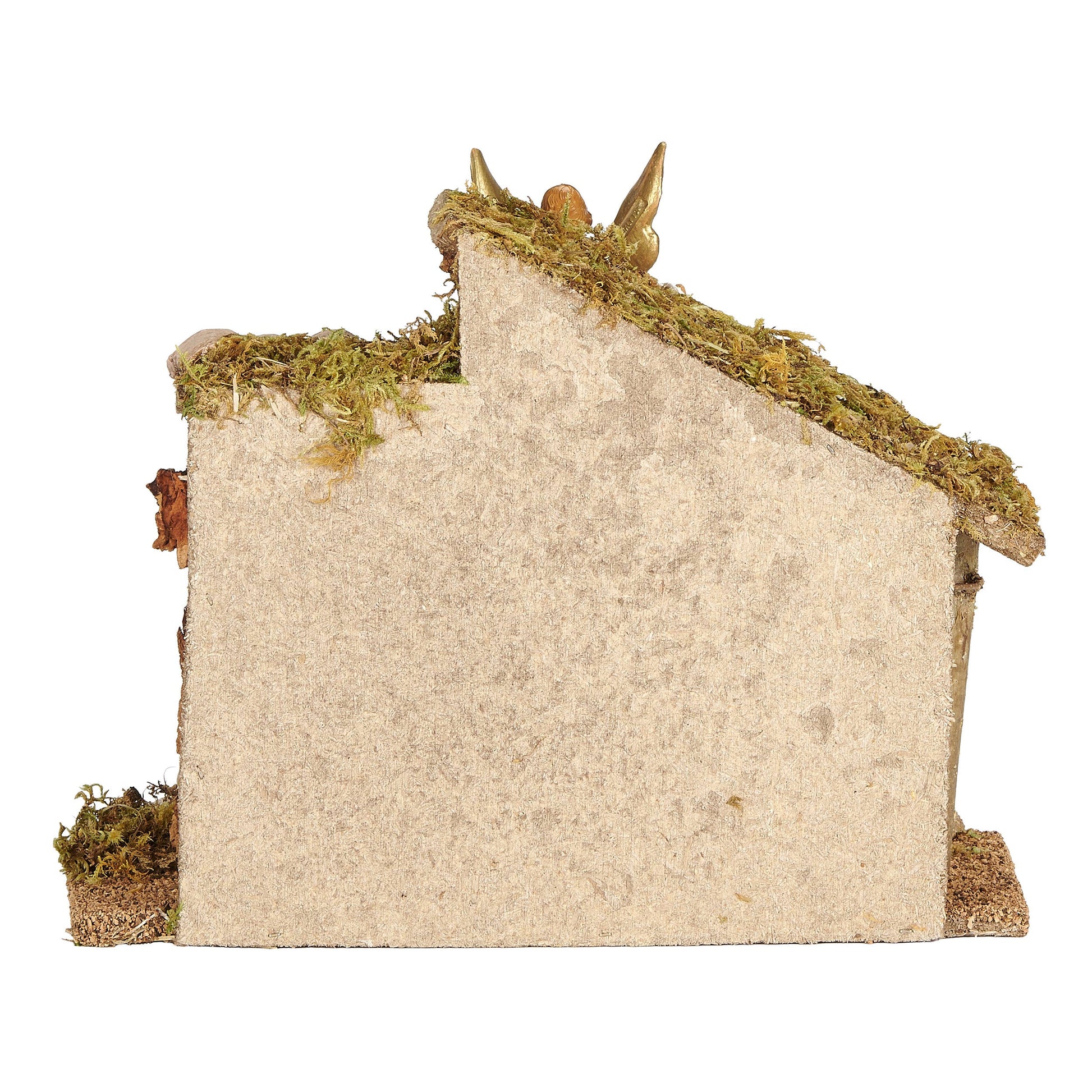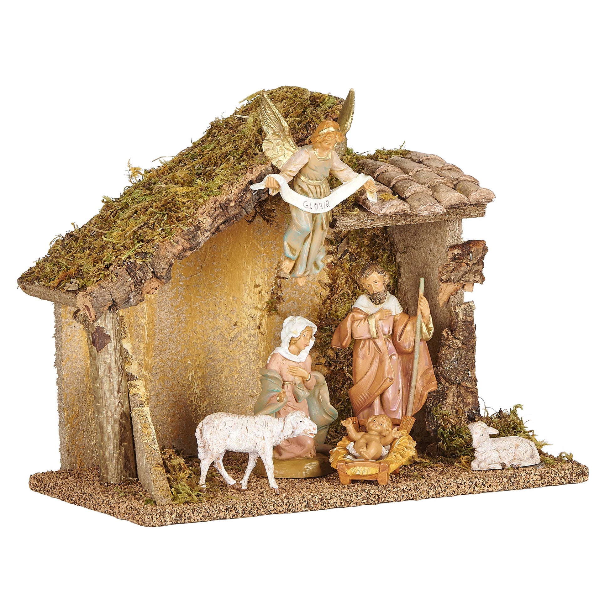 A classic 6-piece Fontanini Nativity featuring the Holy Family, two sheep, and a Gloria Angel in a moss-covered Italian stable. Crafted from wood, bark, and terra-cotta toned tiles, this piece brings warmth and traditional Fontanini character to holiday and faith assortments.
