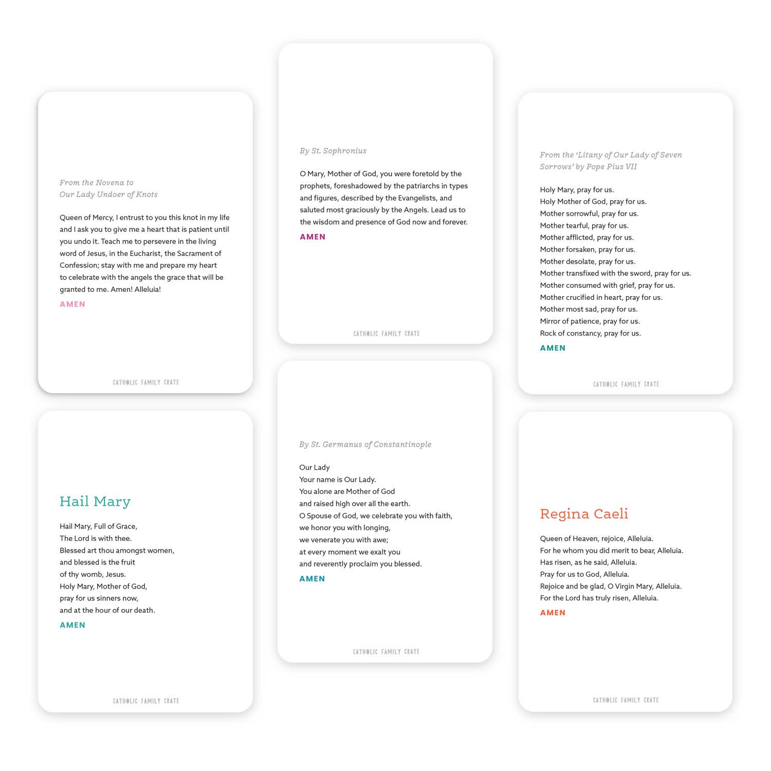 9 unique cards with an illustration of Mary on one side and a Marian prayer on the back - each card is repeated 3 times