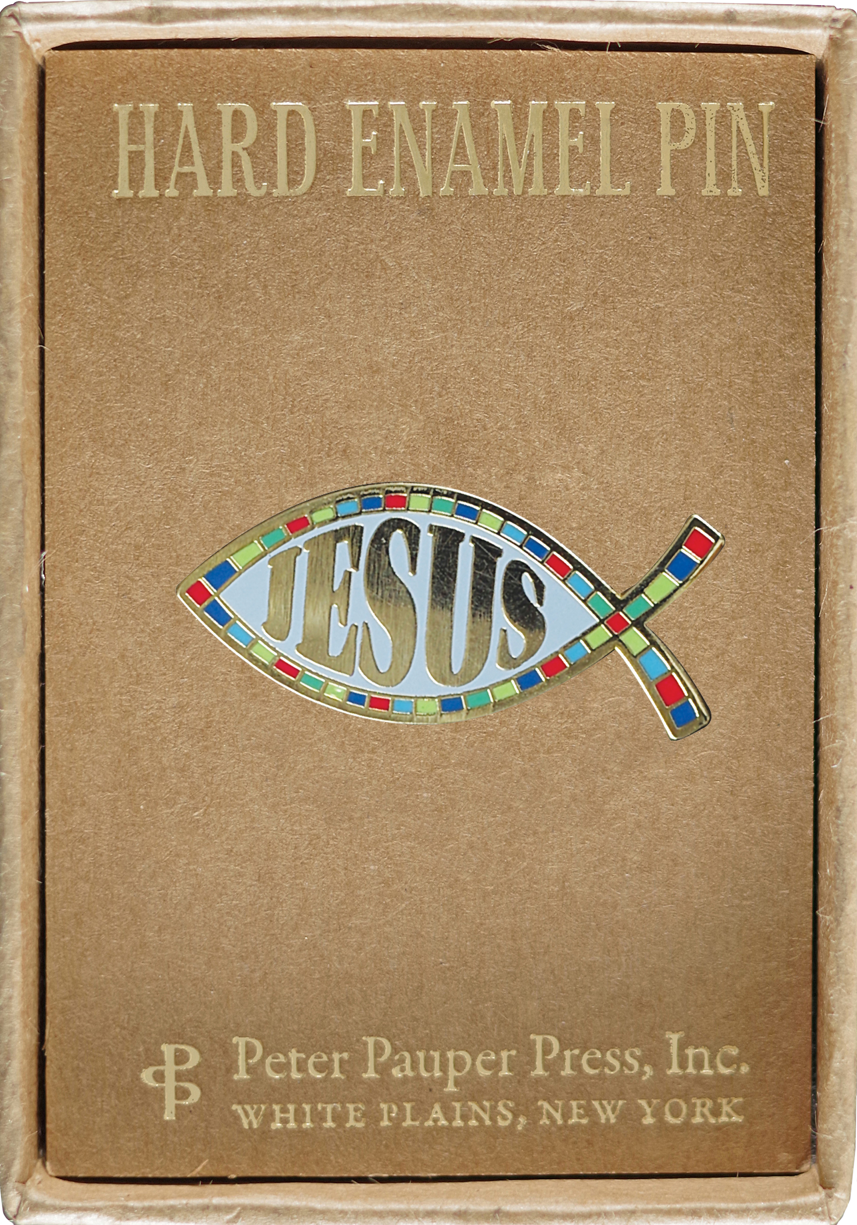The ancient fish-shaped ichthys symbol, which represents Jesus, comes from the Greek word for ''fish'' and dates from the second-century A.D. Hard enamel pin is made using the traditional cloisonne technique. Pin features a detailed design and bold colors. Quality construction, jewelry-grade, durable hard-enamel finish. Rubber clutch backing fastens securely. Comes with a natural Kraft gift box with acetate lid and gold foil treatment. Gift box measures 2-3/8'' wide x 3-1/4'' high.
