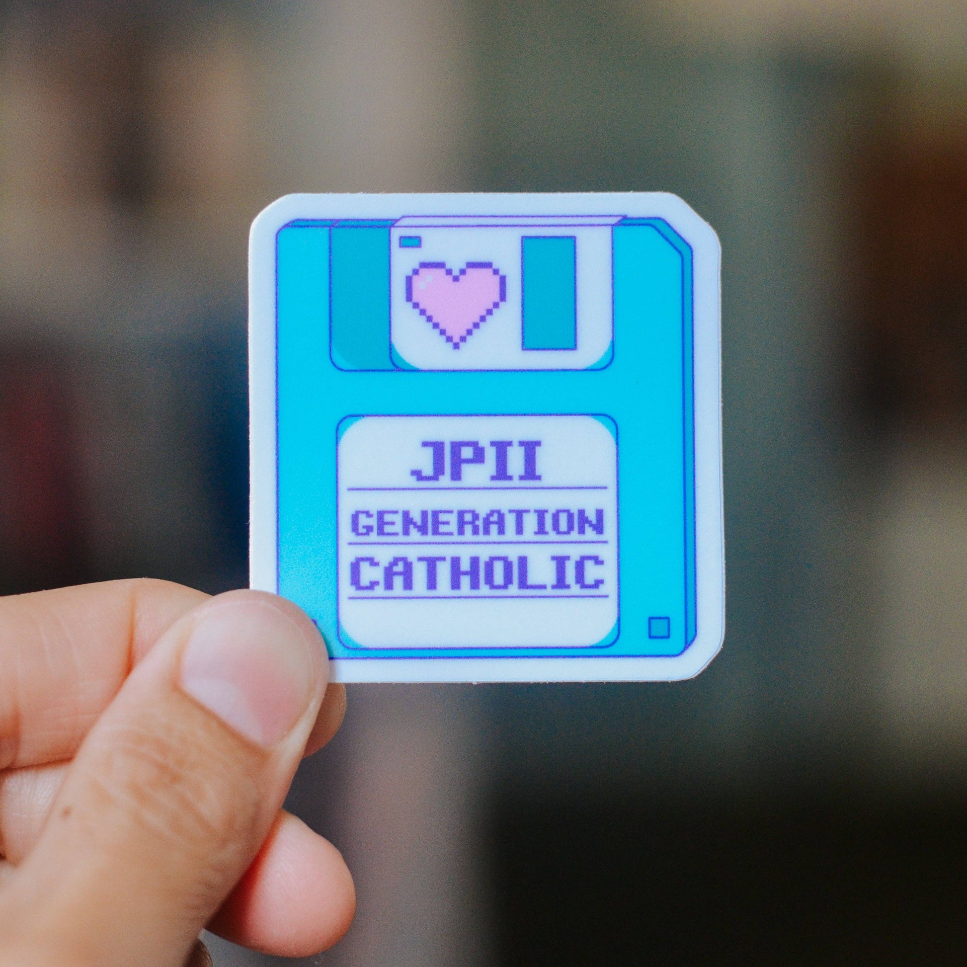 A fun floppy disk Catholic sticker design honoring all the then-young Catholics during the John Paul II papacy that are now devoted Catholic adults!