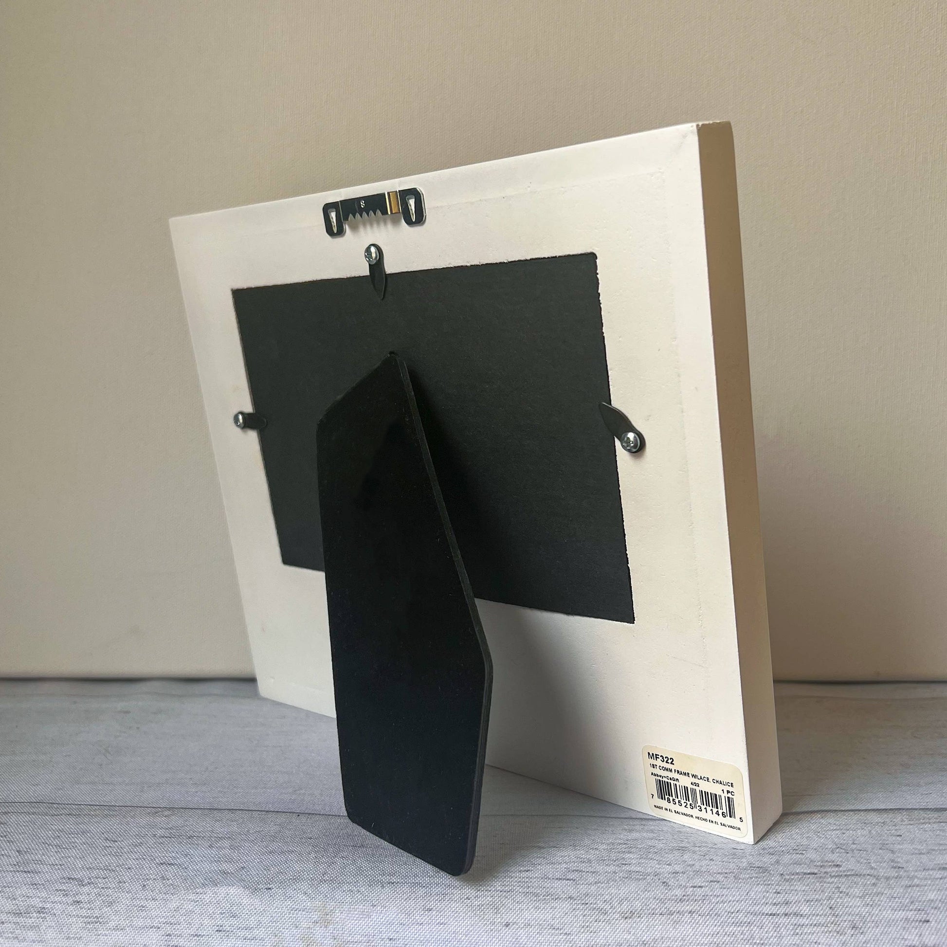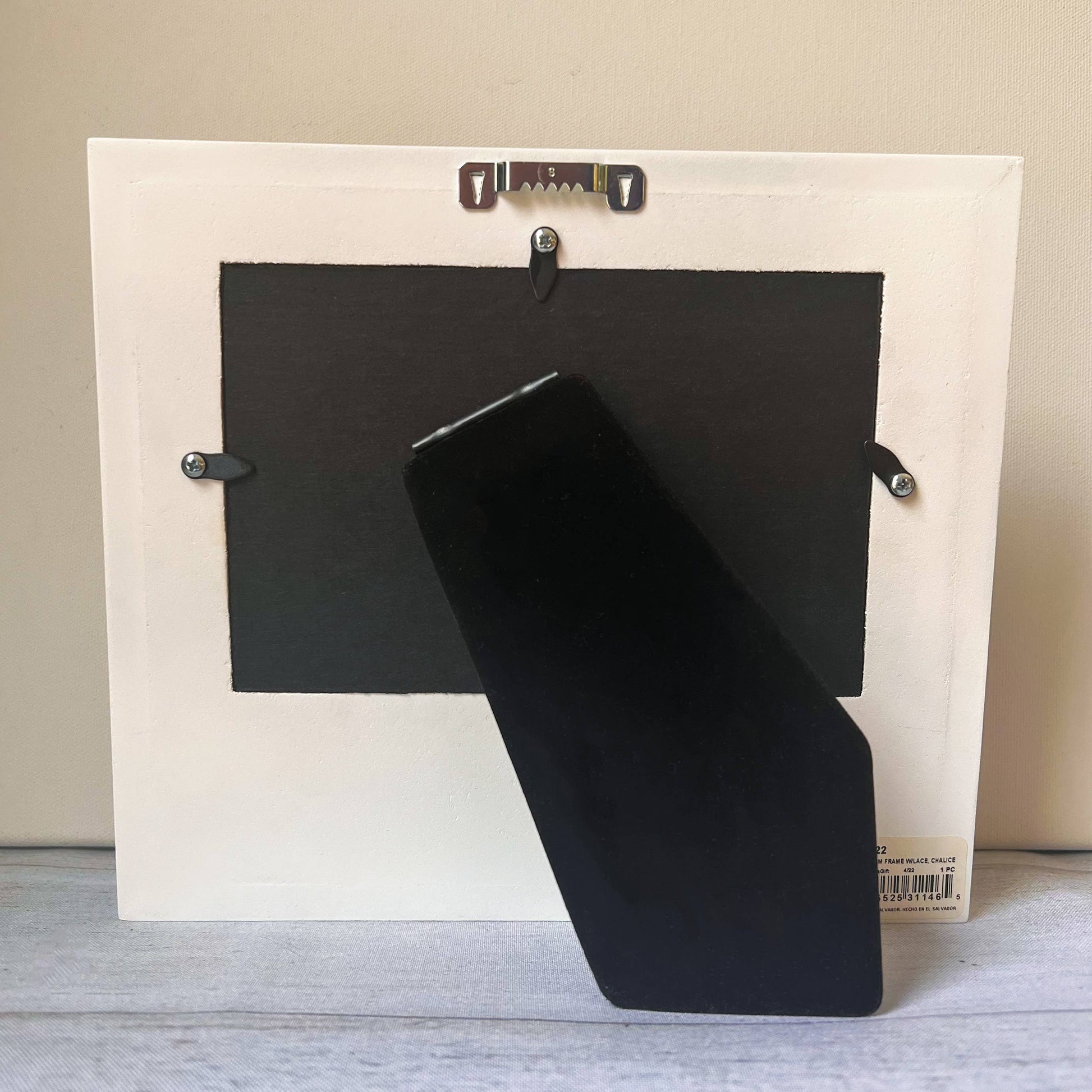 Whitewashed Composite Material communion frame, w/sparkling lace matte & metal chalice accent, holds 4" x 6" photo, "may our lord…" hangs/stands, boxed.
