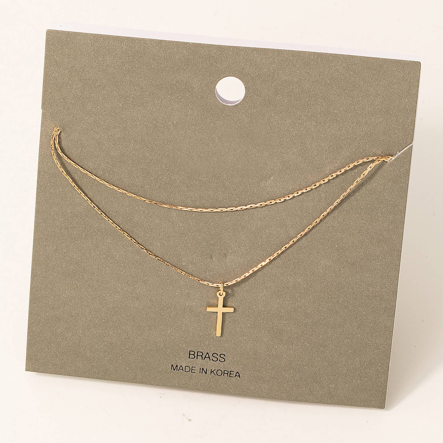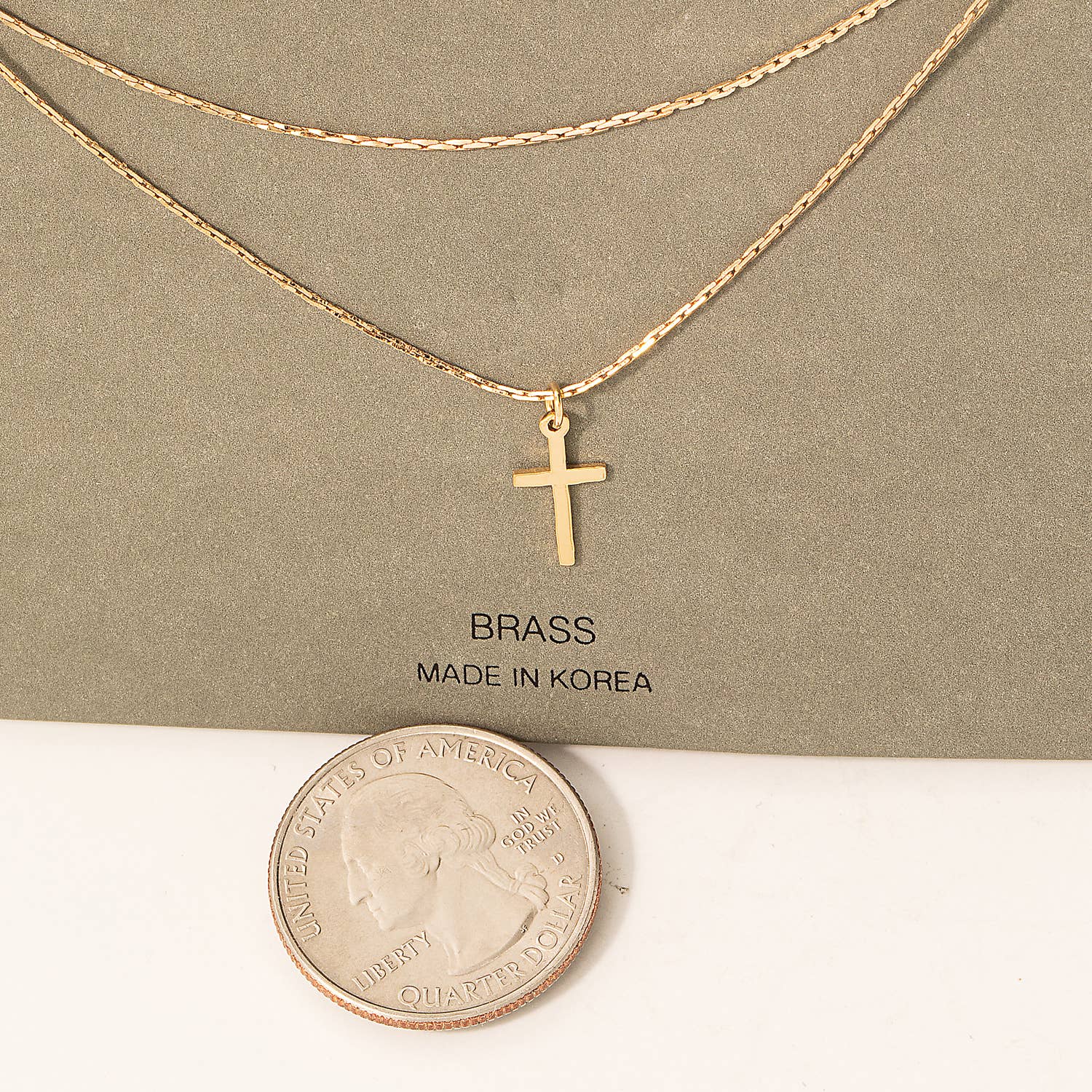 Product: Layered Chain Cross Pendant Necklace. Description: This piece by Fame Accessories is a charming testament to enduring style. Measuring an approximate length of 16+2 inches, this necklace features a layered chain design adorned with a cross pendant. Crafted in the heart of Downtown LA's Fashion District, this necklace is a testament to the brand's commitment to creating unique, timeless designs. Please note, a minimum order of 2 is required.