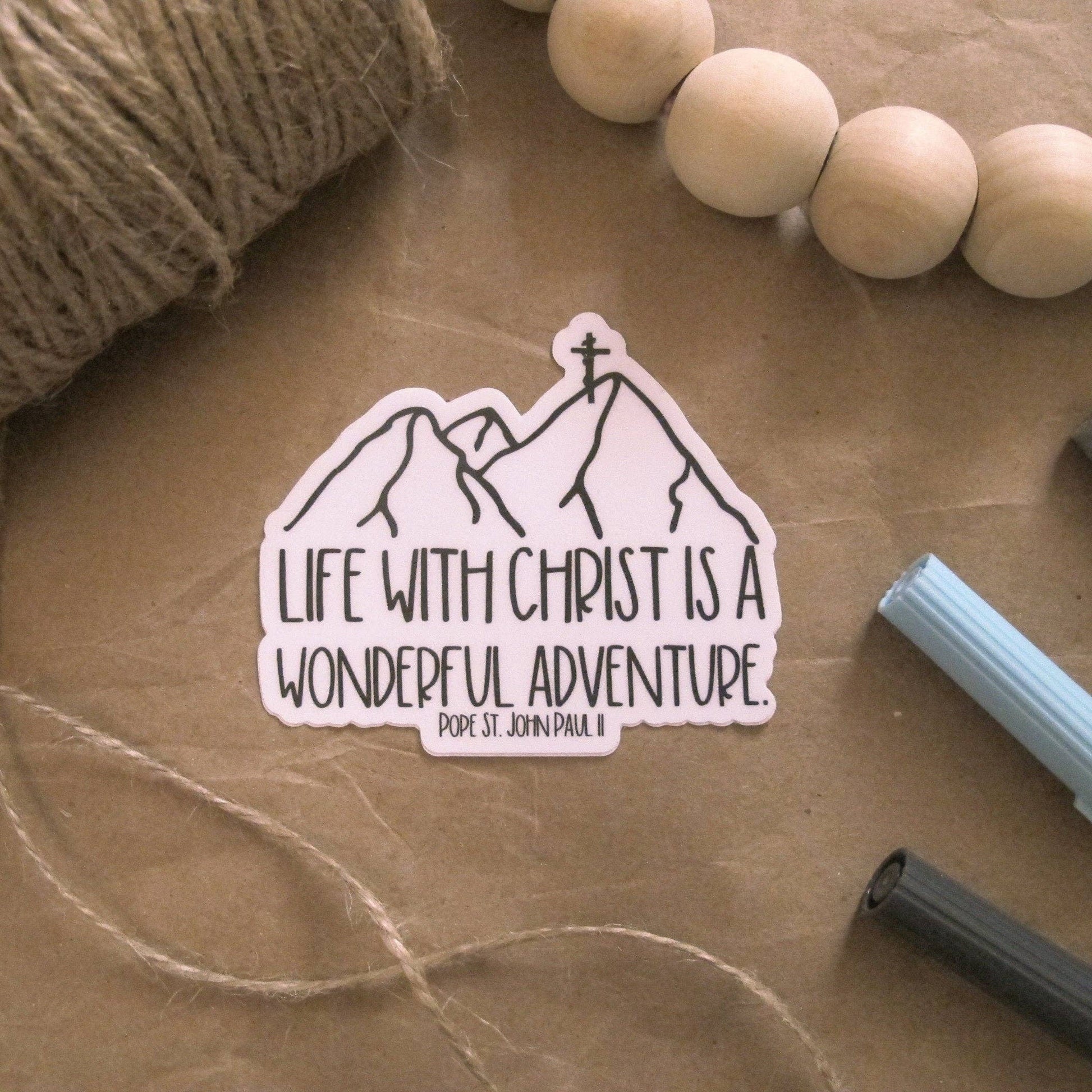 The waterproof Life with Christ vinyl sticker will last on any water bottle, laptop, phone case, prayer journal, or car window for 3-5 years! These Catholic quote stickers spread encouragement anywhere they are attached.