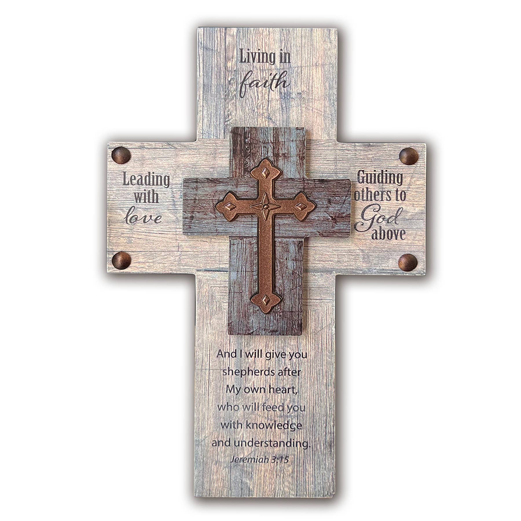 Layered matte sublimated MDF with rustic cross and rivets finished in antique bronze. Hangs or stands. 5 ½” W x 8 ½” H. Boxed.