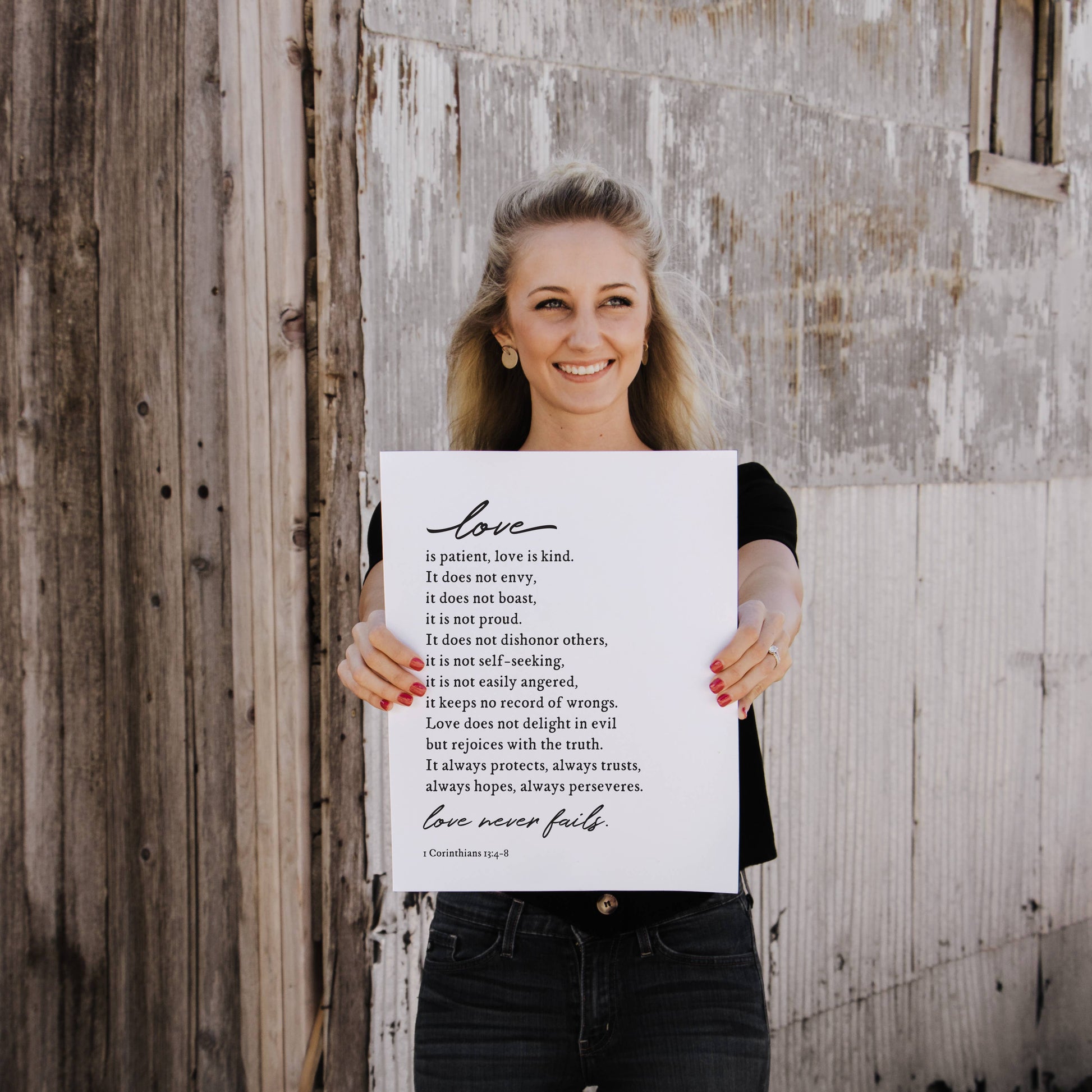 Love is patient, love is kind. It does not envy, it does not boast, it is not proud. It does not dishonor others, it is not self-seeking, it is not easily angered, it keeps no record of wrongs. Love does not delight in evil but rejoices with the truth. It always protects, always trusts, always hopes, always perseveres. love never fails. 1 Corinthians 13:4-8