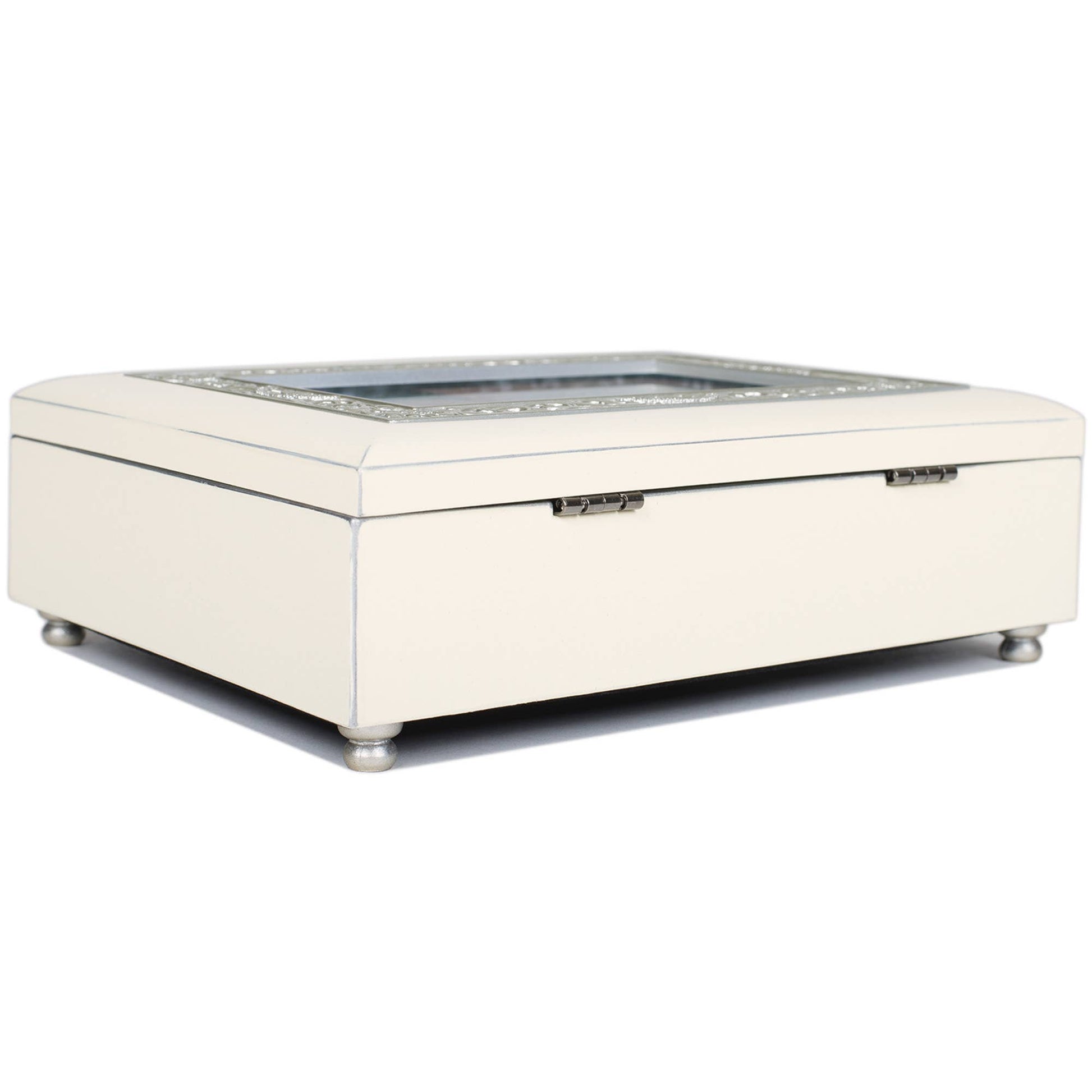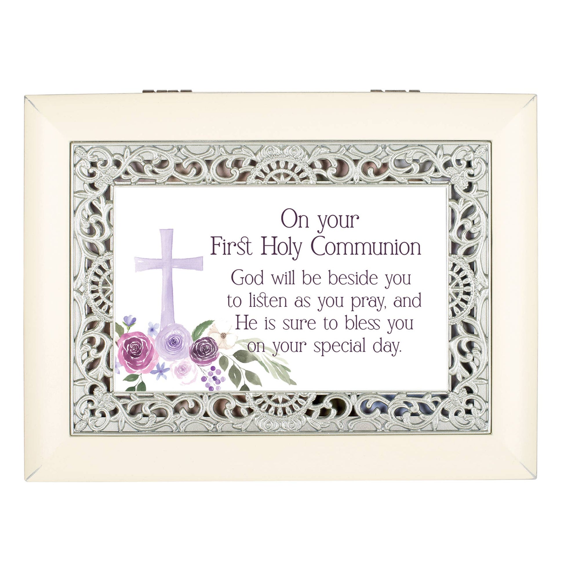 Gorgeous Musical Keepsake Box Is An Excellent Gift Choice. Box Is A Curved Bevel Style With Ivory Tone Finish. The Hinged Lid Is Also A Photo Frame, Under Glass, Featuring Text: On Your First Holy Communion - God Will Be Beside You To Listen As You Pray, And He Is Sure To Bless You On Your Special Day. Frame Area Of Lid Is Intricate Filigree With A Metallic Silver Finish. Print Can Easily Be Changed Out For A 6x4 Photo. Inside Box Is A Small Compartment With Clear Glass Top That Shows The High Quality Sankyo Musical Movement. When Key Under Box Is Wound, Music Will Play When Lid Is Open And Stop When It Is Closed. Plays The Song: Ave Maria. Storage Compartment Has A Luxurious Black Velvety Lining. Decorative Silver Tone Legs On Bottom Are Padded To Protect Furniture. Box Is Made Of A Super-Sturdy Polymer That Resists Cracking And Chipping. Overall Size Is 8 x 6 x 2 5/8.
