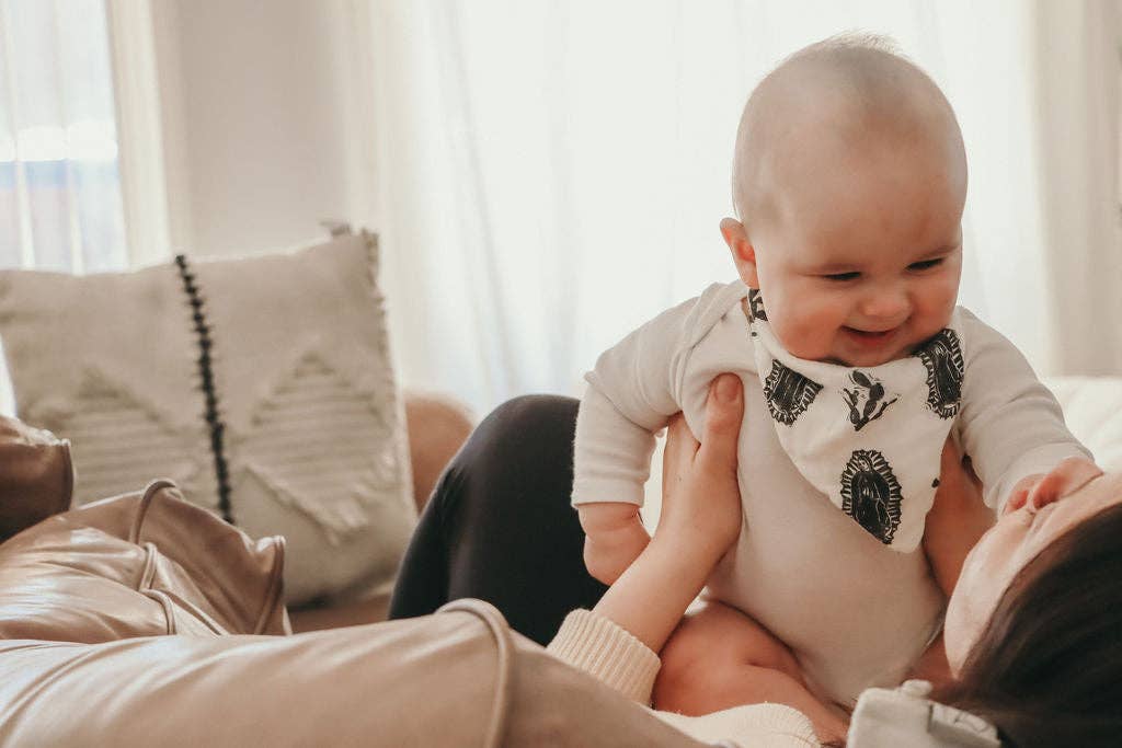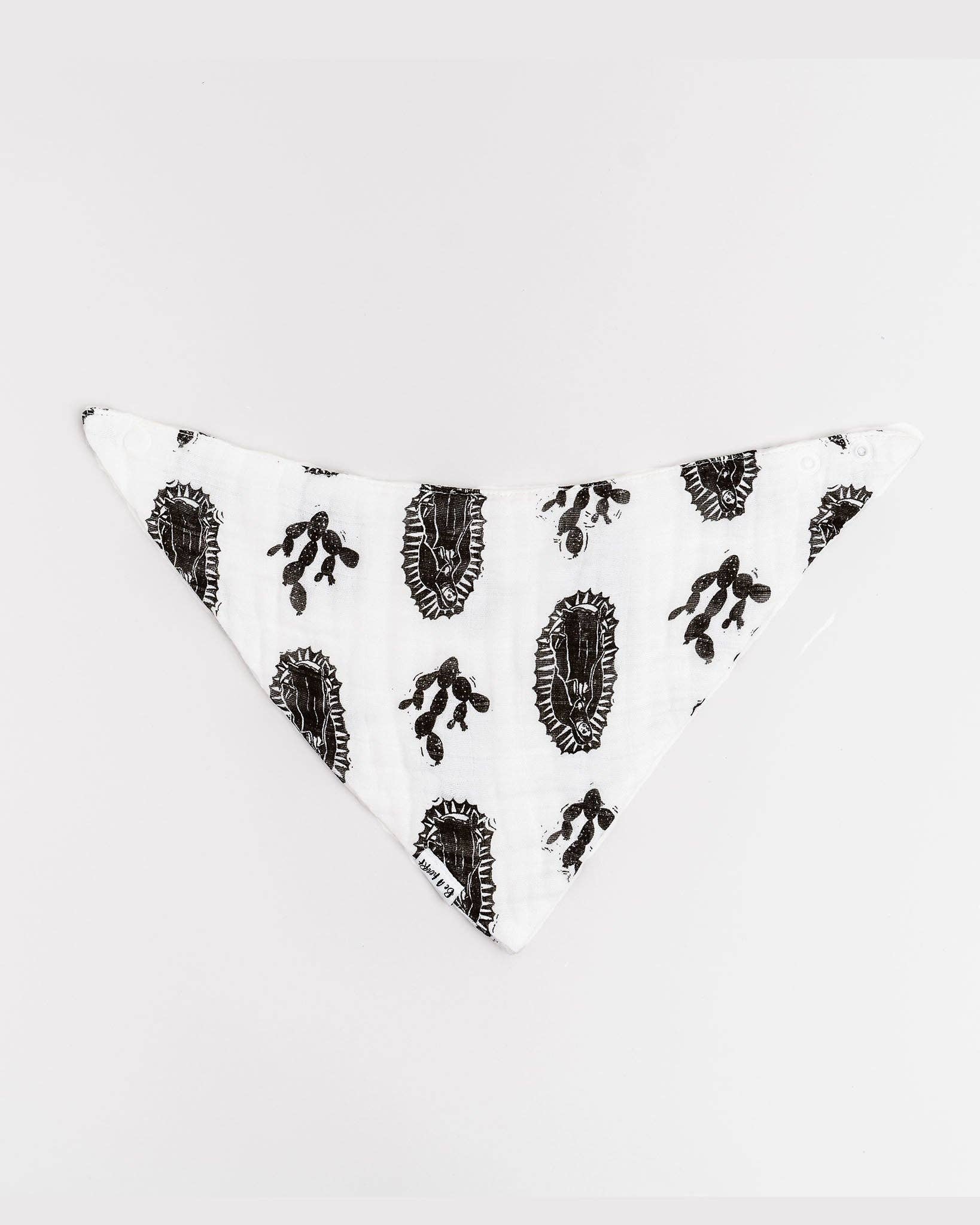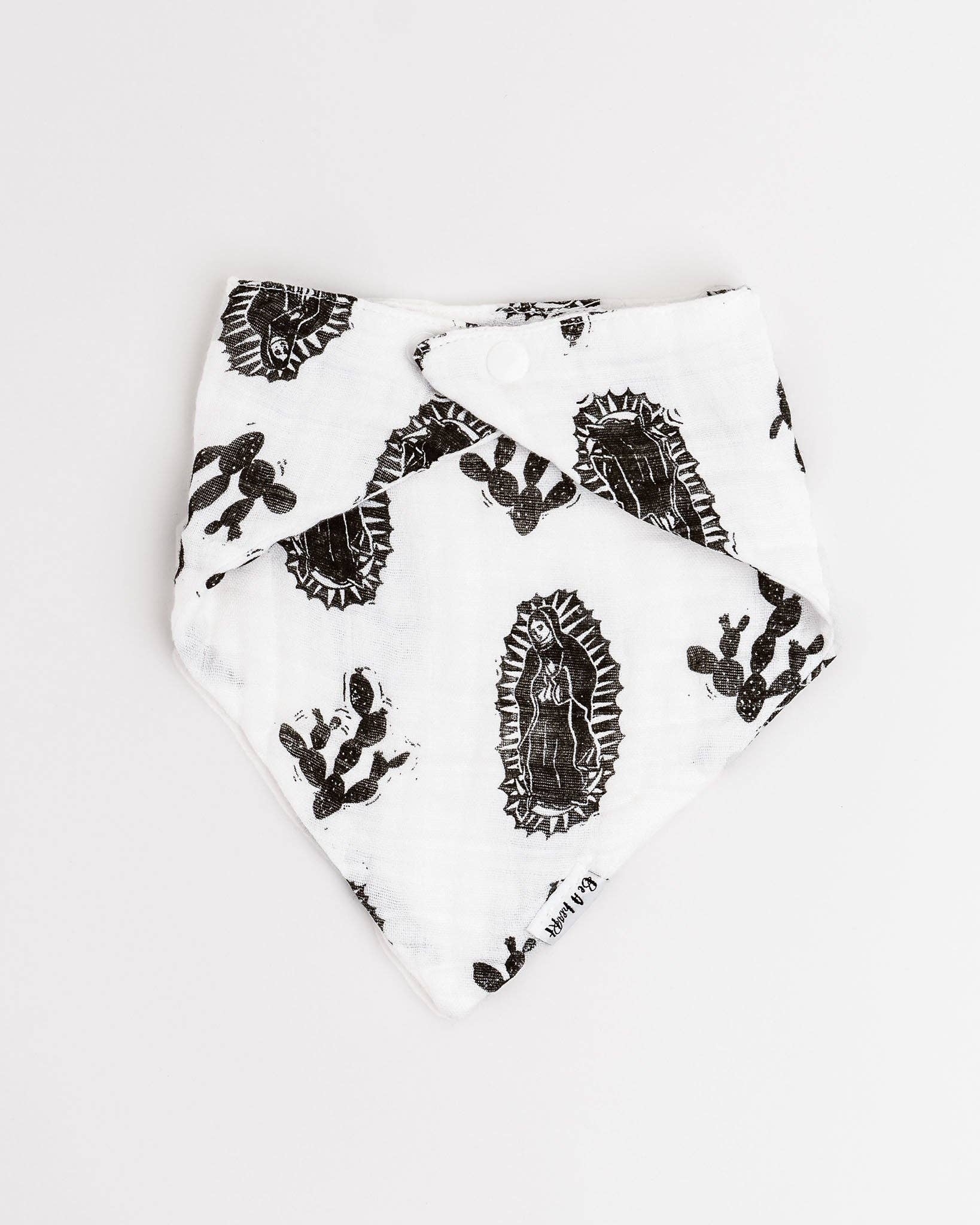 The Our Lady of Guadalupe Drool Bib is made of organic cotton and bamboo muslin fabric. There are two snaps for adjustable sizes. Drool bibs are great to protect clothing throughout the day from spit up and drool.
