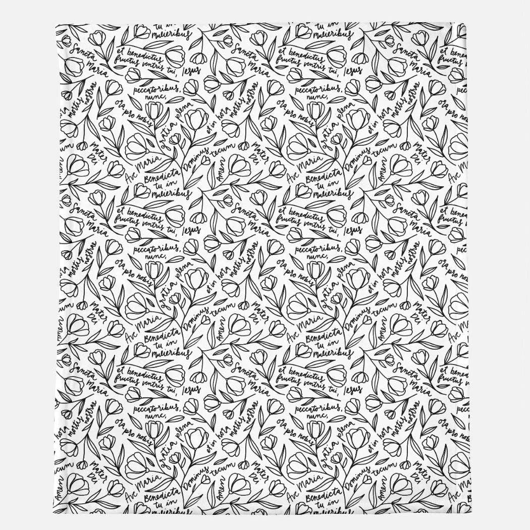 Blanket has Ave Maria prayer design to wrap up in prayer! Size: 30” x 40” Solid White Backside Material: Ultra-Smooth Micro-Mink Polyester Care: Machine Wash Cold, Tumble Dry. Please keep in mind, we strive for accurate photography - however, coloring may vary from screen to screen.