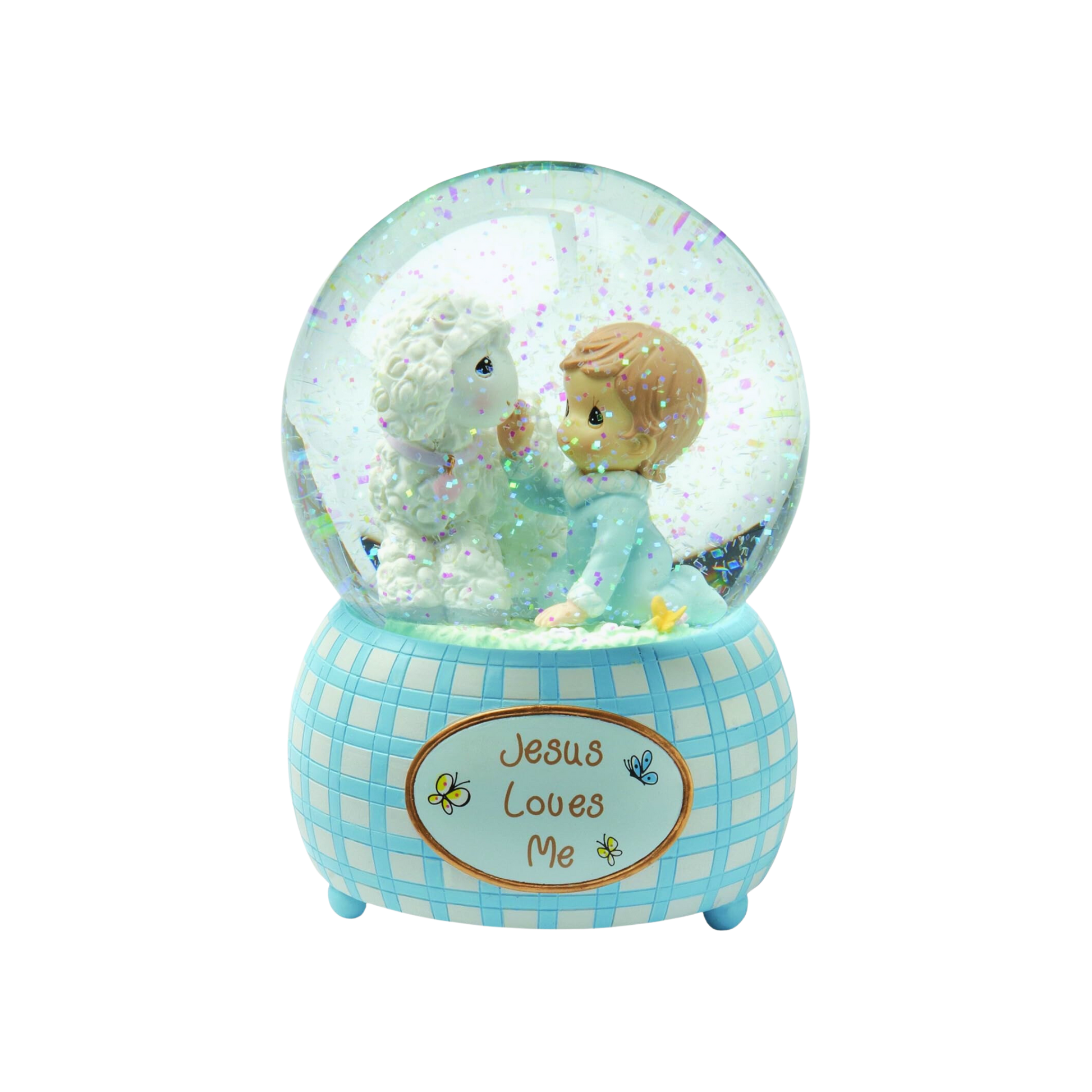 - A little boy shares a tender moment with a gentle lamb to illustrate Jesus' unfailing love. Featuring a sweet blue checked pattern, this 100mm snow globe plays the tune “Jesus Loves Me”.