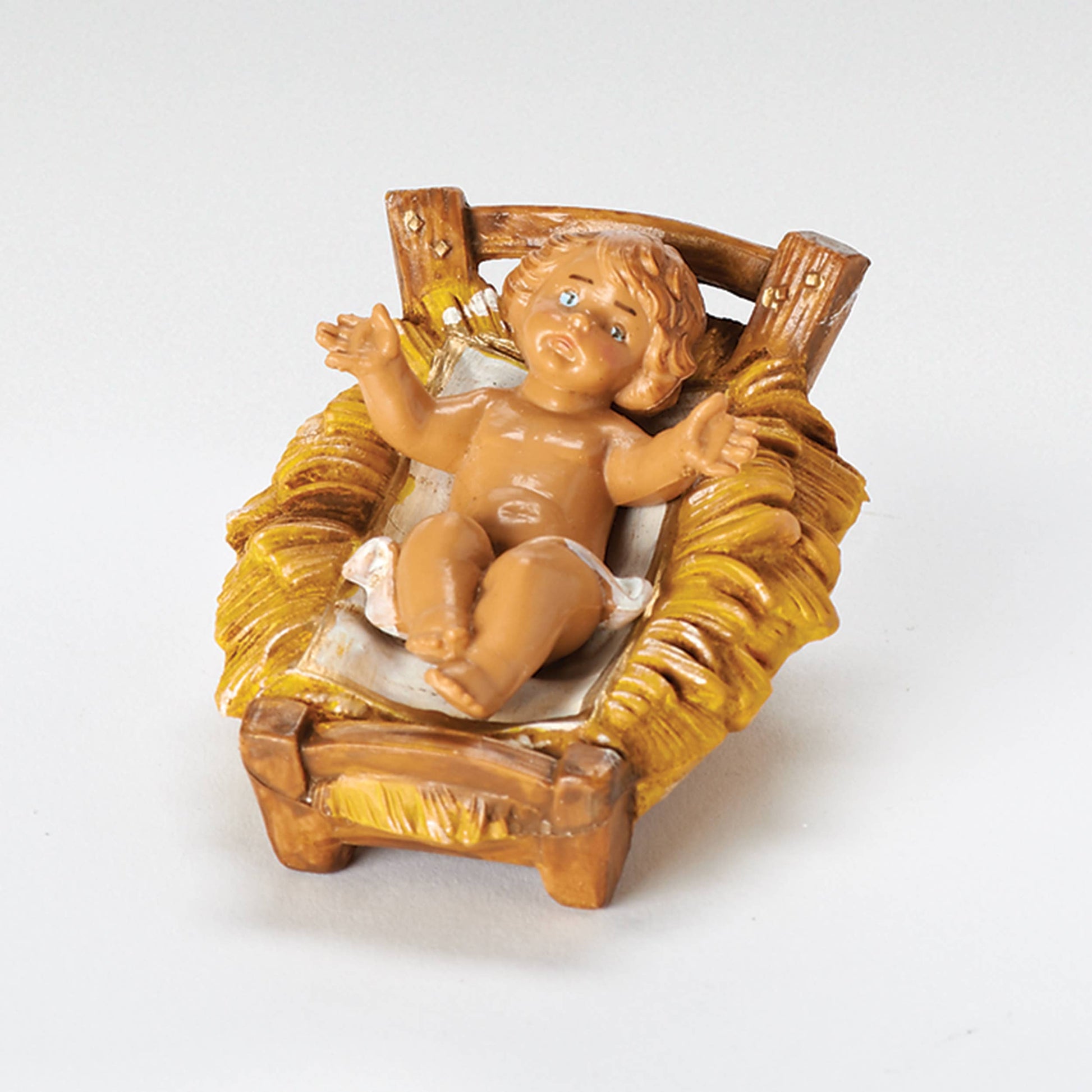 The centerpiece of every Nativity, this Baby Jesus rests in a detailed manger with straw-like accents. The Infant figure is removable from the crib, allowing flexible display and adding a meaningful touch to the Holy Family scene. Measuring approximately 2¼" long, this figure is perfectly scaled to complete the 5" Fontanini® Classic Holy Family Collection. Key Features: 5" scale Nativity piece; Baby measures approx. 2¼" long Removable Infant from the manger for versatile display Made of durable polymer; hand-painted with lifelike detail Includes collectible story card