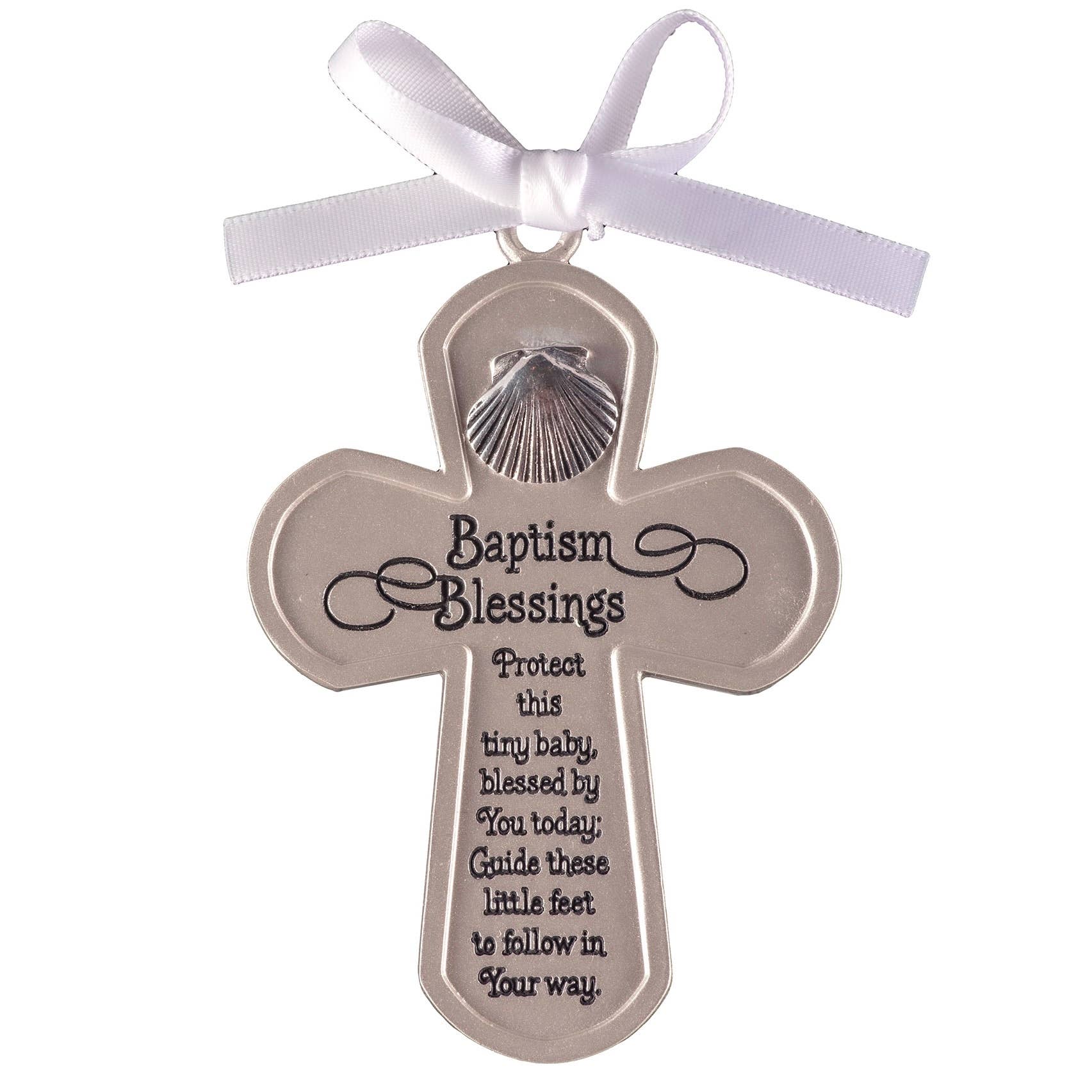 Cast metal baptism cross in silver enamel finish, space to engrave on back, hangs from white ribbon, gift boxed.