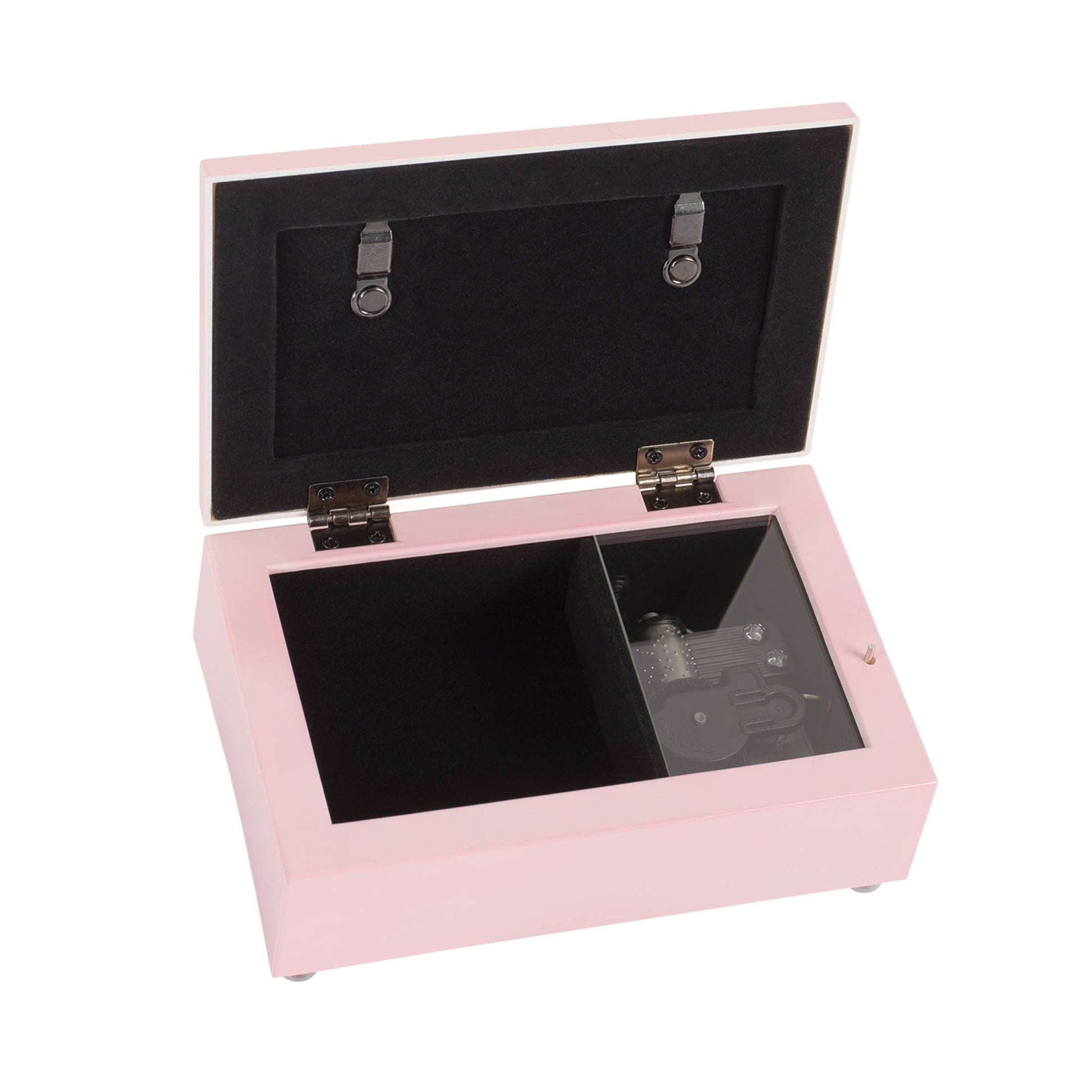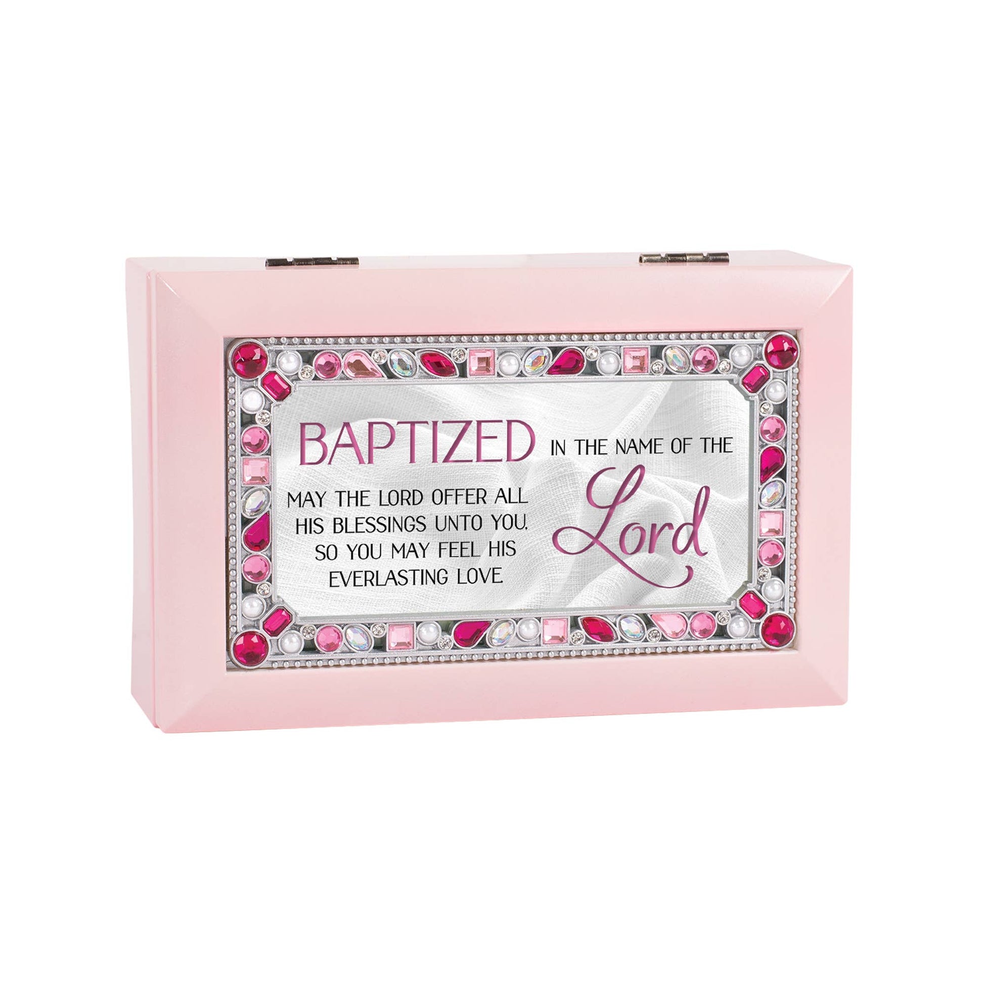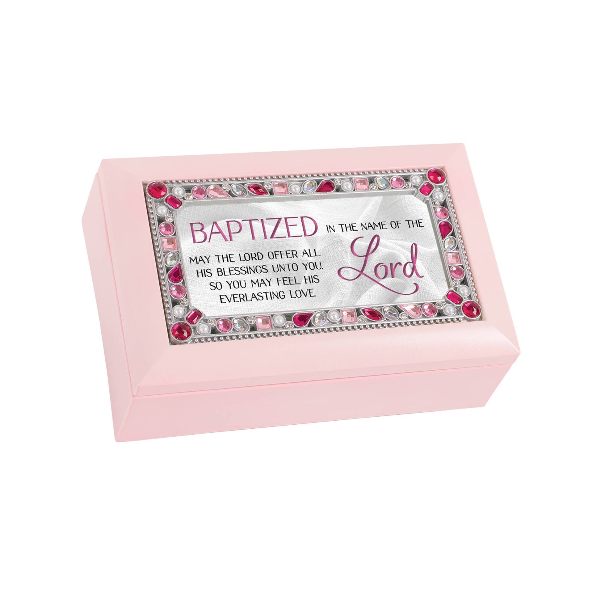Baptized in the name of the Lord. May the Lord offer all His blessings unto you, so you may feel His everlasting love. A sparkling array of pink and clear stones are set in dainty beaded antique silver trim on this petite pink keepsake box. The hinged lid is also a photo frame; it includes art print, under glass, with sentiment. Print can be changed out for a favorite photo cut to 2 3/8" x 4 5/8"; window size at top is 4" x 2". Frame has removable back under lid. Inside box is a small compartment with clear glass top that shows the high quality Sankyo musical movement. When key under box is wound, music will play when lid is open and stop when it is closed. Plays the song "Friend in Jesus." Storage compartment has a luxurious black velvety lining. Decorative legs on bottom are padded to protect furniture. Box is made of a super-sturdy polymer that resists cracking and chipping. Overall size is 6" x 4" x 2 5/8".