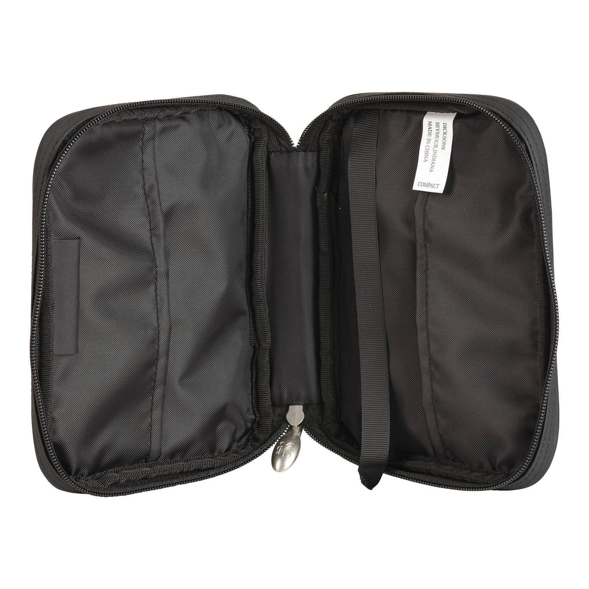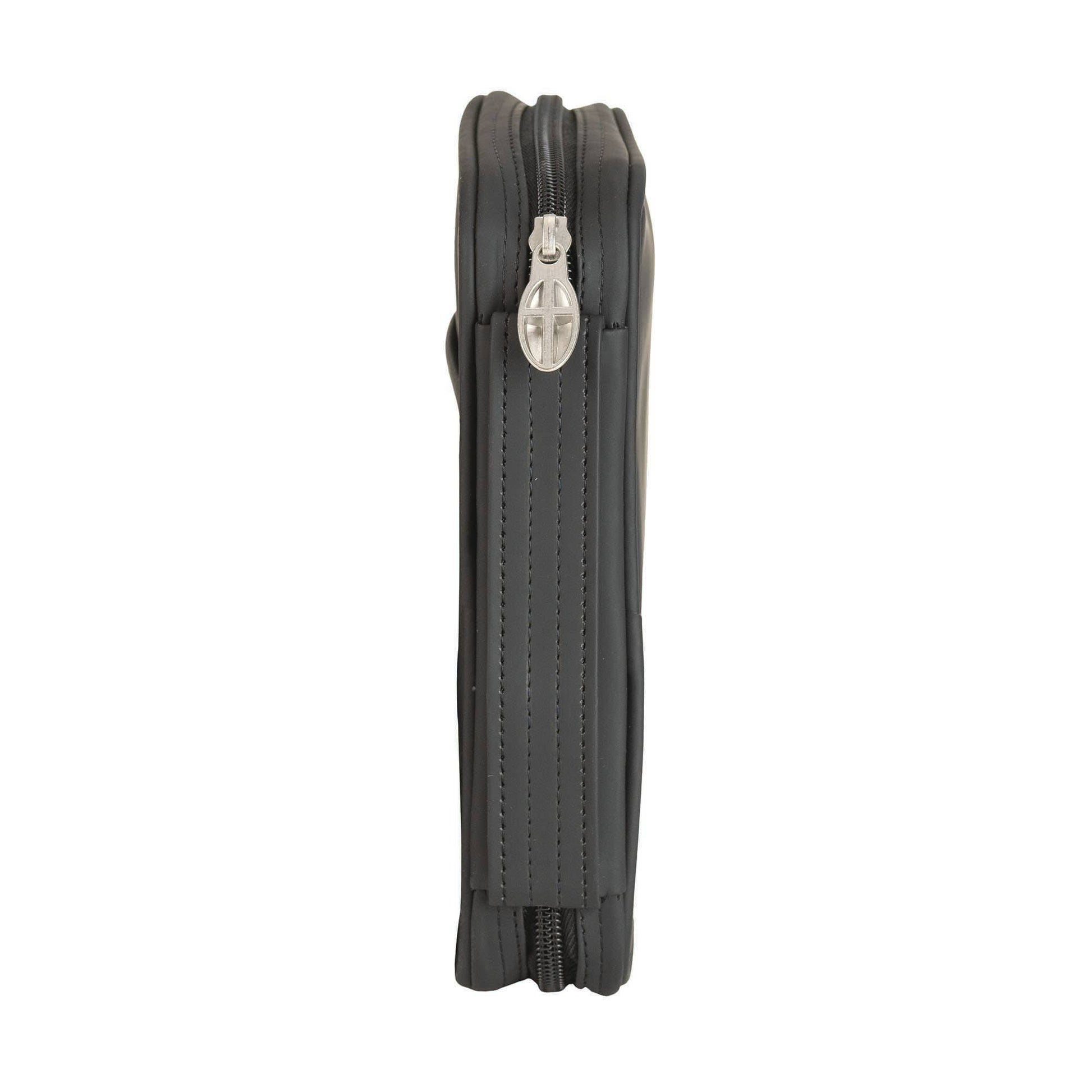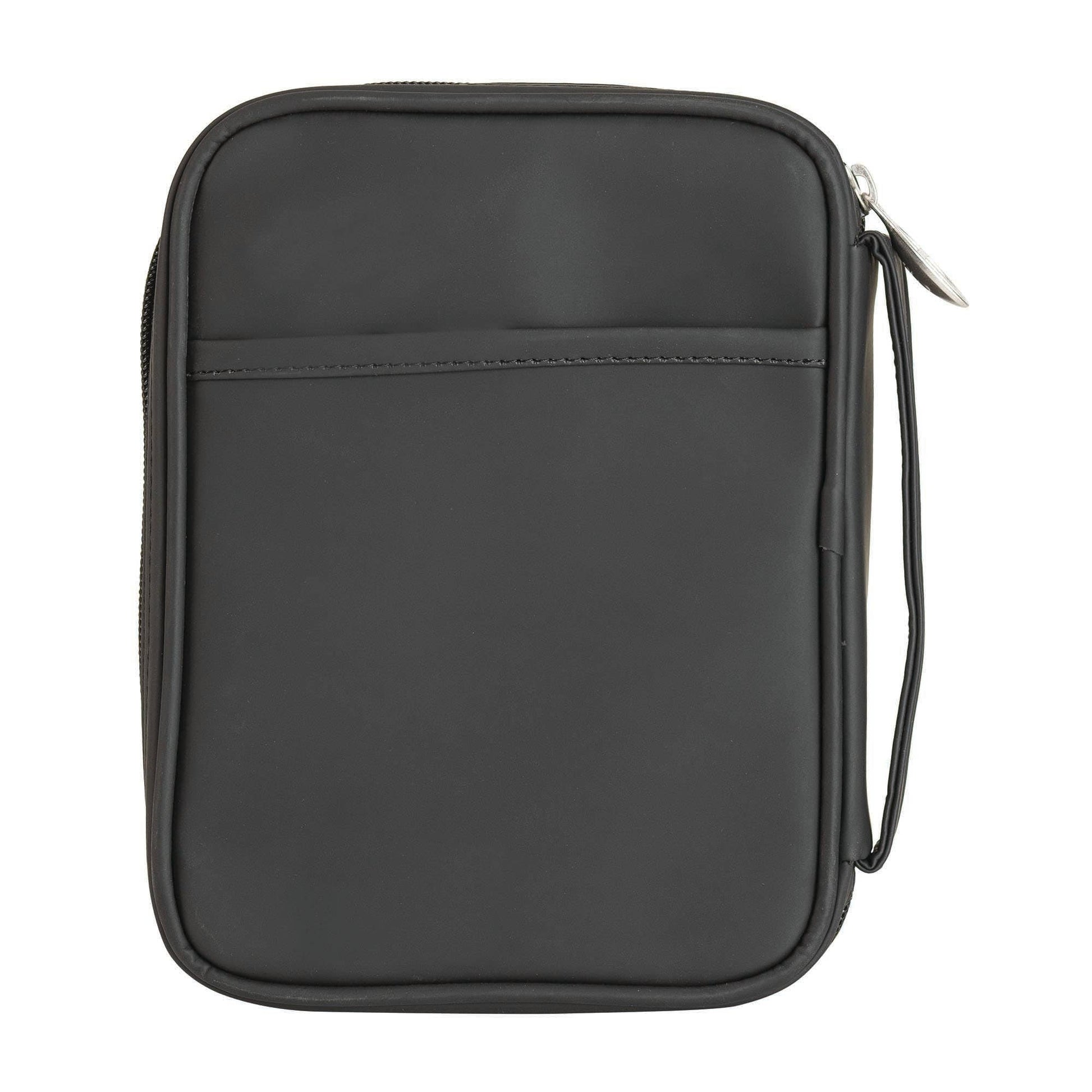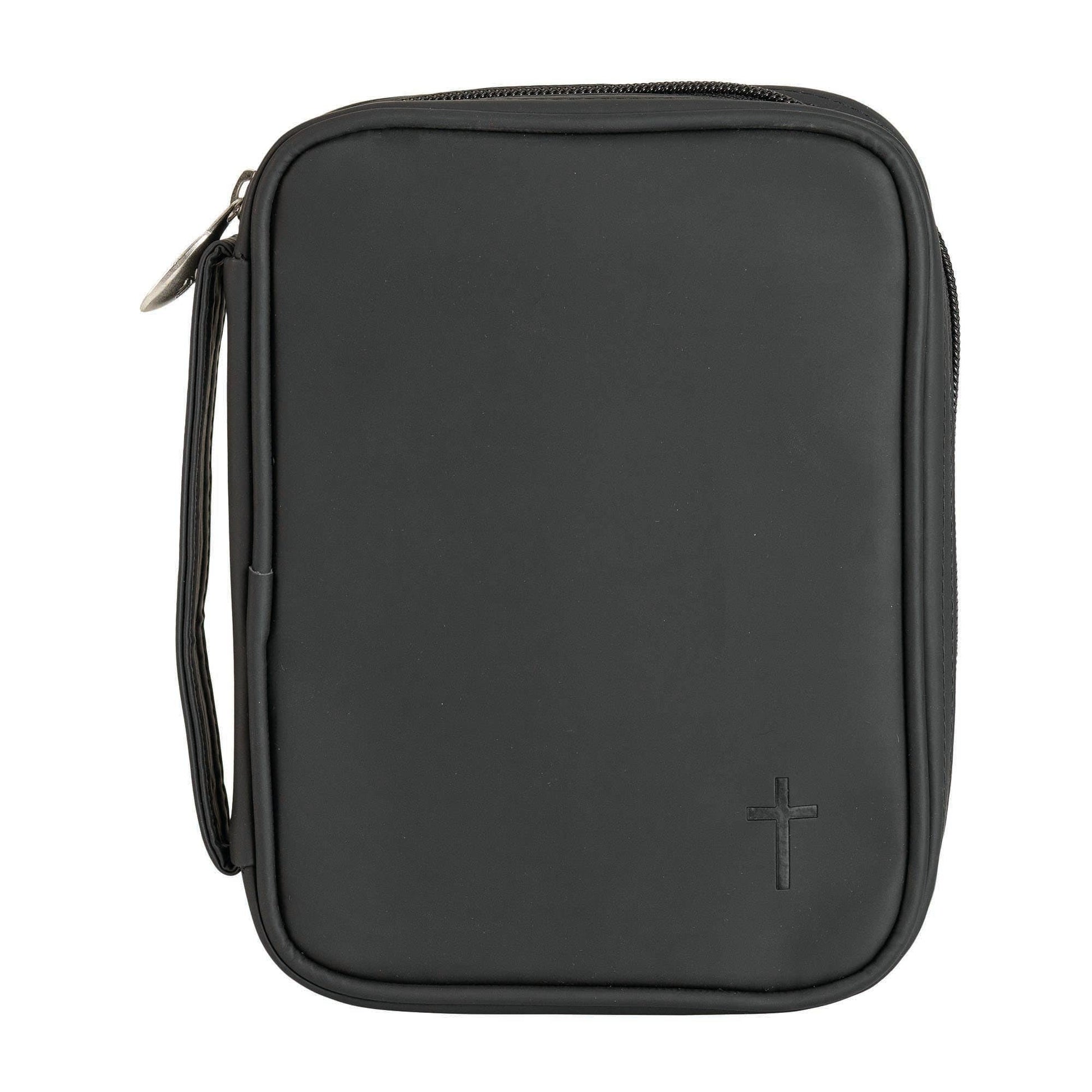 Compact size matte vinyl bible cover is perfectly sized for your compact bible, up to around 5" x 7" x 1 1/2". Smooth matte finish cover is imprinted with cross in lower right corner. Convenient side carrying handle; open storage pocket on back. The non-rusting, self-repairing zipper is finished with a spoon-style pull featuring a debossed cross. Inside is black fabric lined, with attached ribbon bookmark and loop for your pen. Cover lays flat when open for easy reading and study.