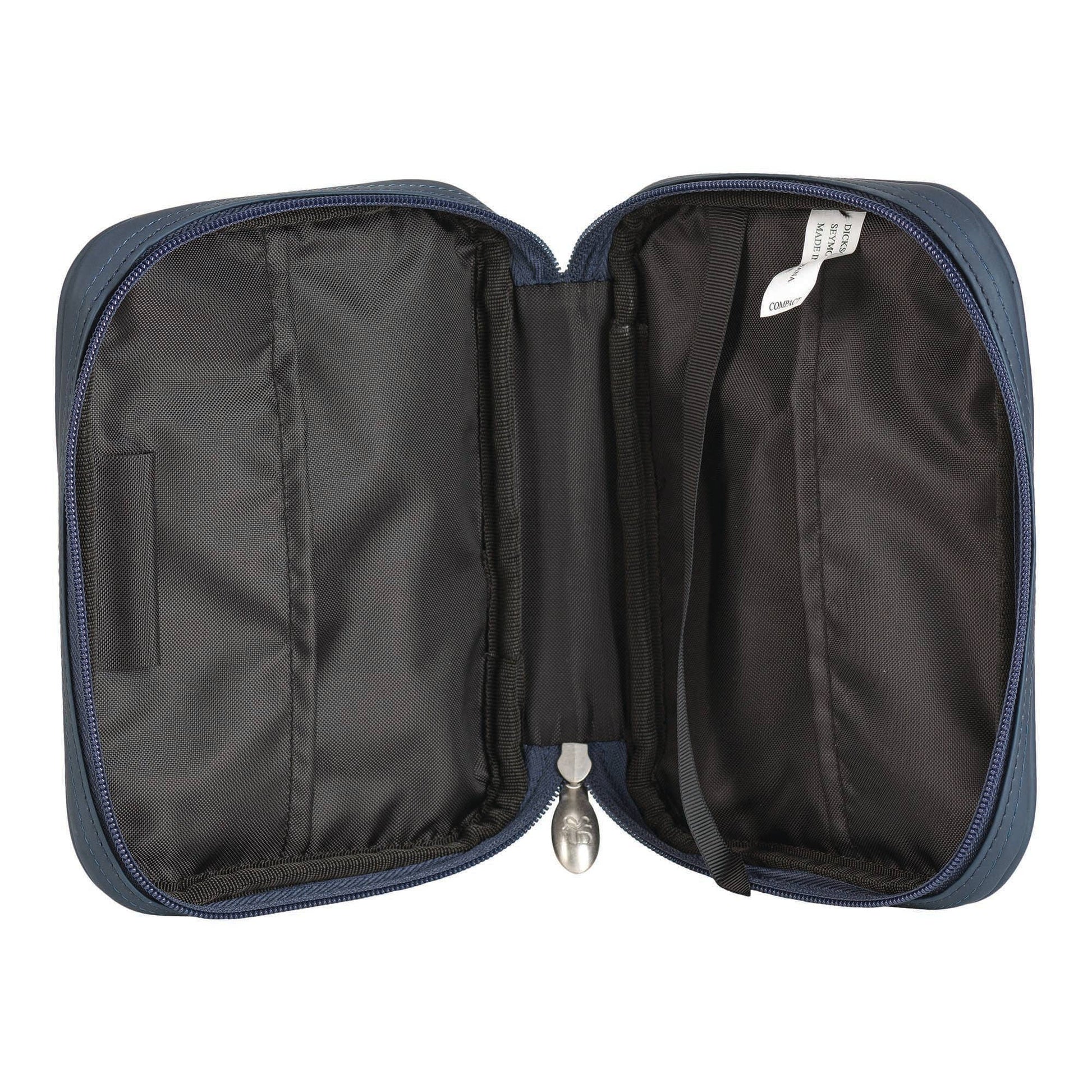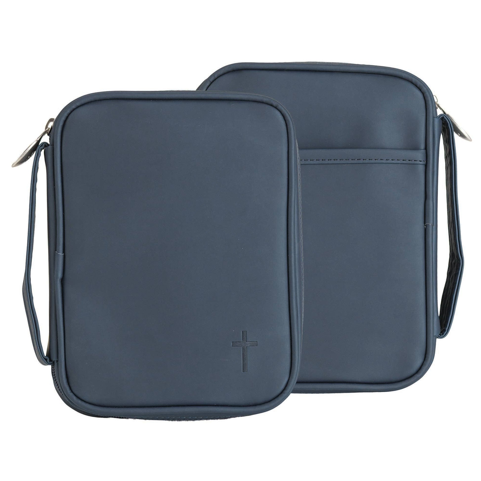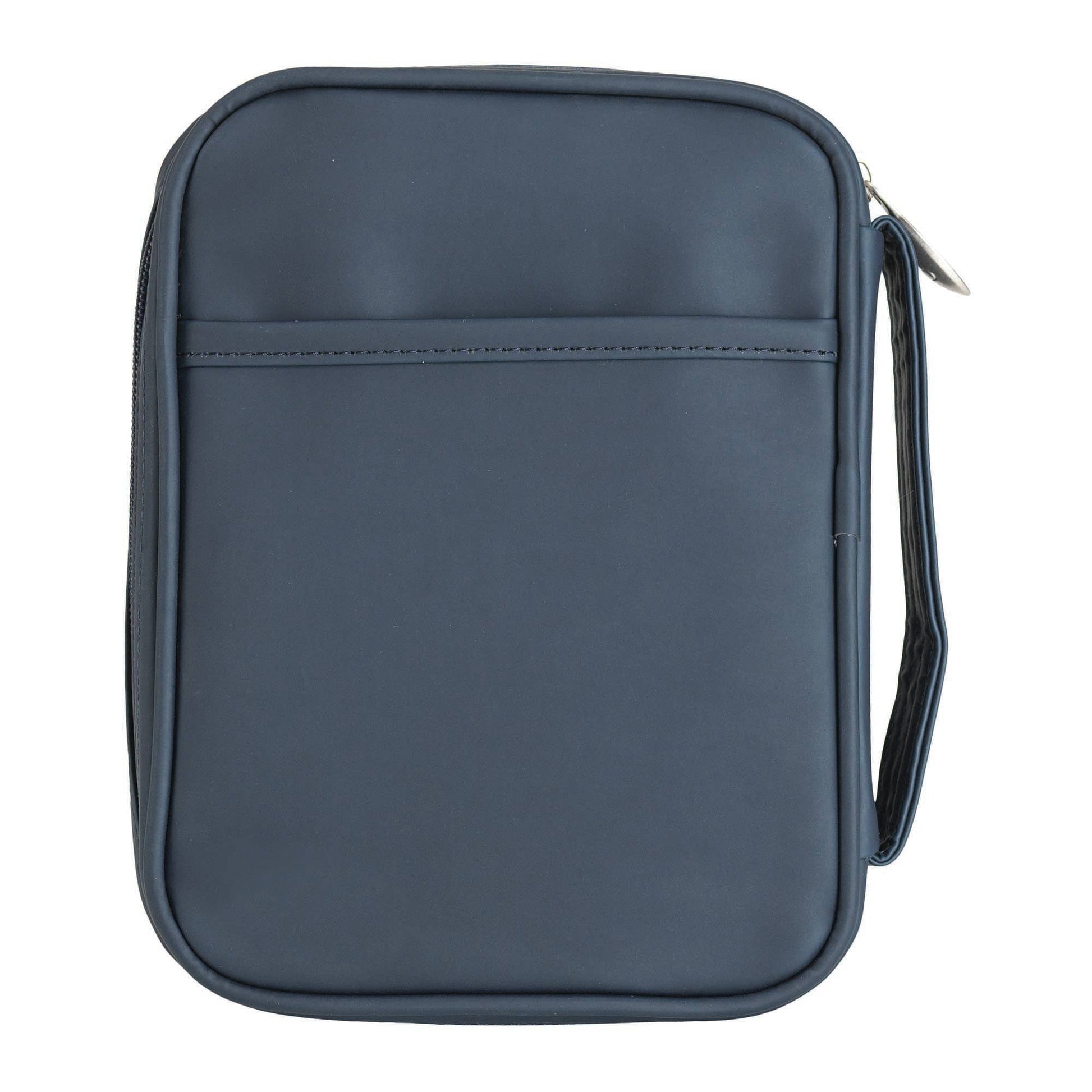 Compact size matte vinyl bible cover navy blue this cover is perfectly sized for your compact bible, up to around 5" x 7" x 1 1/2". Smooth matte finish cover is imprinted with cross in lower right corner. Convenient side carrying handle; open storage pocket on back. The non-rusting, self-repairing zipper is finished with a spoon-style pull featuring a debossed cross. Inside is black fabric lined, with attached ribbon bookmark and loop for your pen. Cover lays flat when open for easy reading and study. Color is navy blue.