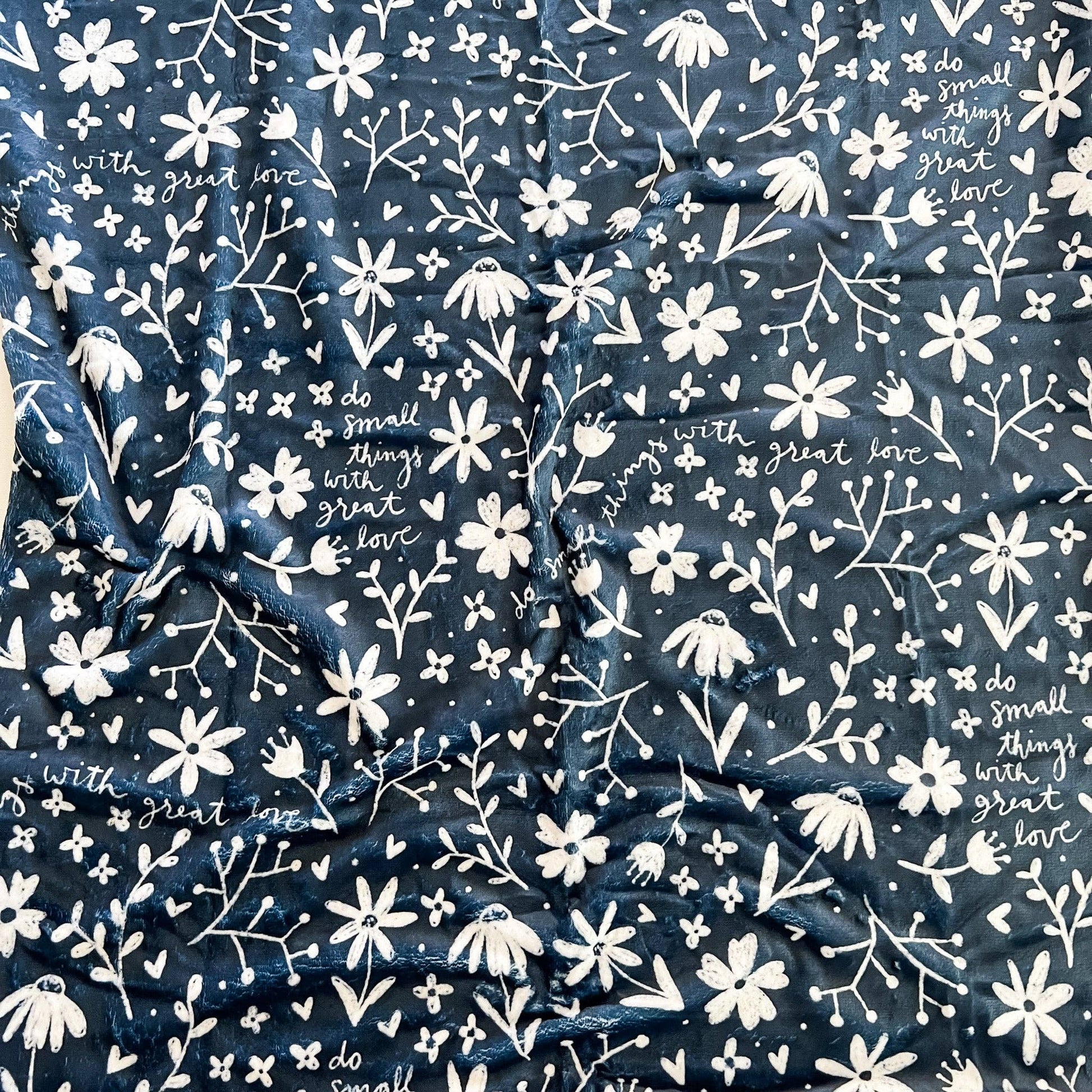 Gorgeous blue and white floral pattern has hidden encouragements "do small things with great love" scattered throughout the design - words from Mother Teresa. This Saint inspired blanket is great reminder for bringing faith into everyday life. Baby Size: 30” x 40” Solid White Backside Material: Ultra-Smooth Micro-Mink Polyester Care: Machine Wash Cold, Tumble Dry. Please keep in mind, we strive for accurate photography - however, coloring may vary from screen to screen.