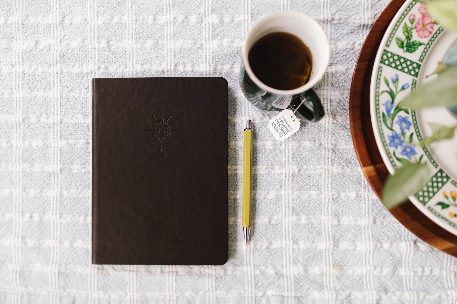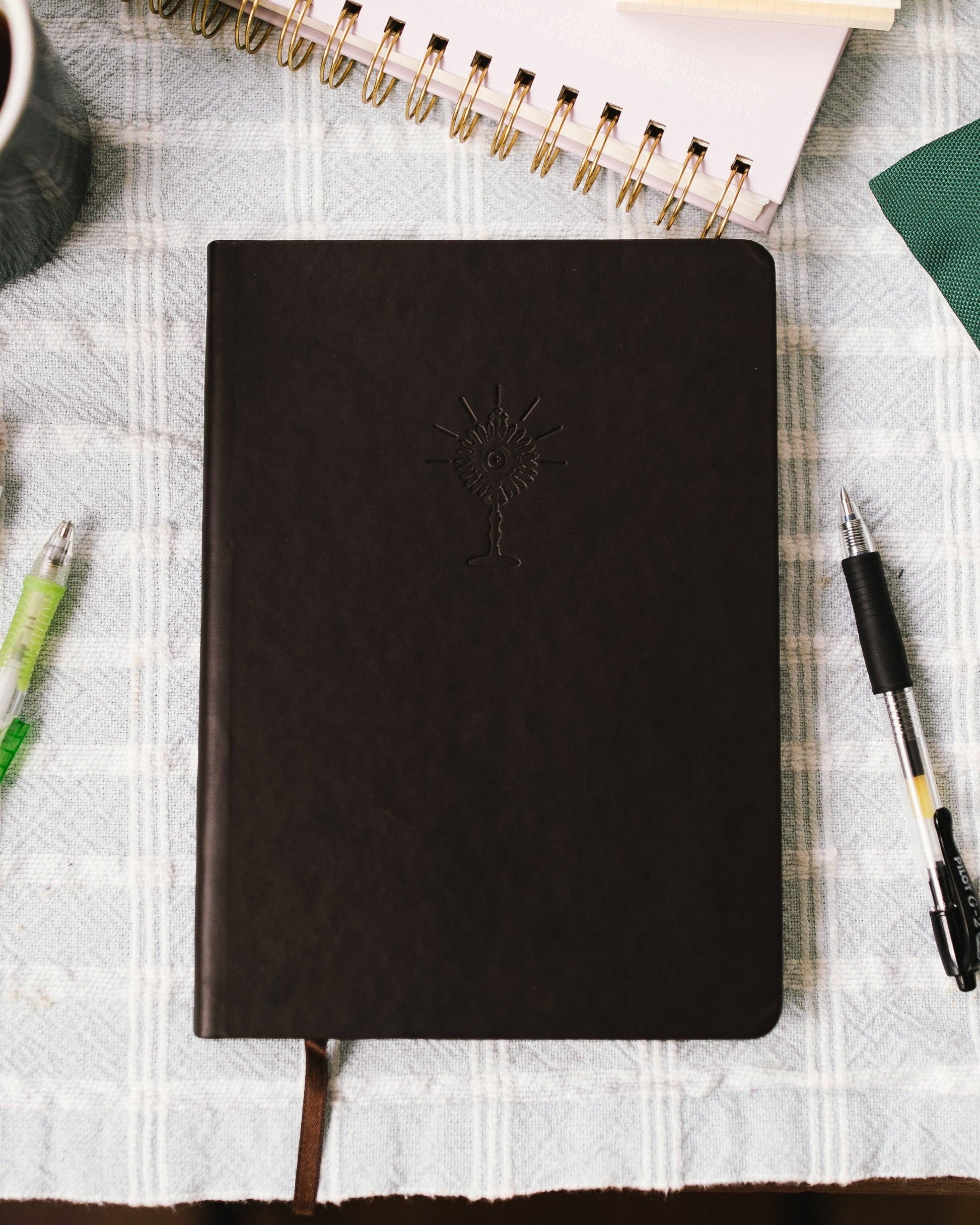 This notebook was designed to turn your gaze towards Christ in prayer. The embossed monstrance represents the gift of the Eucharist that Christ gave us during the Last Supper. It is bound with dark brown faux leather and contains 128 lined pages.