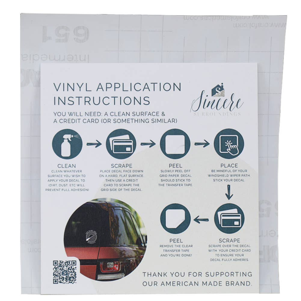 Car Vinyl Decals. Comes in durable white vinyl with application instructions. Individually packaged. Sold in sets of 5. Proudly designed & made in the USA. Dimensions: 2.5" x 2.5" x .25"