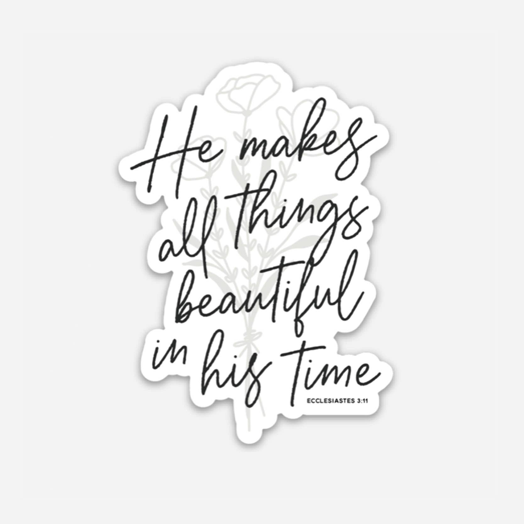 This beautiful verse from Ecclesiastes 3:11 says, He makes all things beautiful in his time. It can be easy to forget that His timing is always perfect - especially when \during a painful season. Let this floral sticker being a sweet reminder of His goodness and ability to work all things together for good. • Size: 2.15" x 3" • Durable weatherproof vinyl sticker Note: Colors may vary slightly from device screen to printed item.