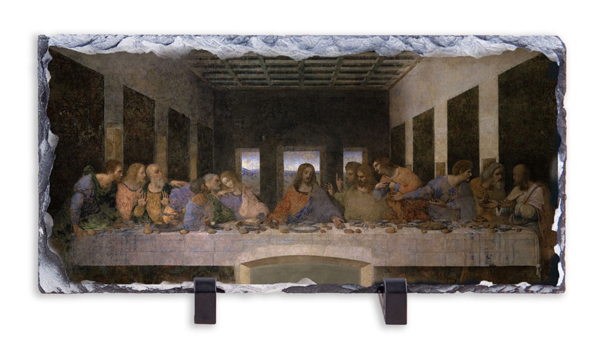 This Last Supper horizontal slate tile comes with two black easel "feet" to allow the tile to stand upright on a desk, shelf, or table. No two slate tiles are 100% alike.