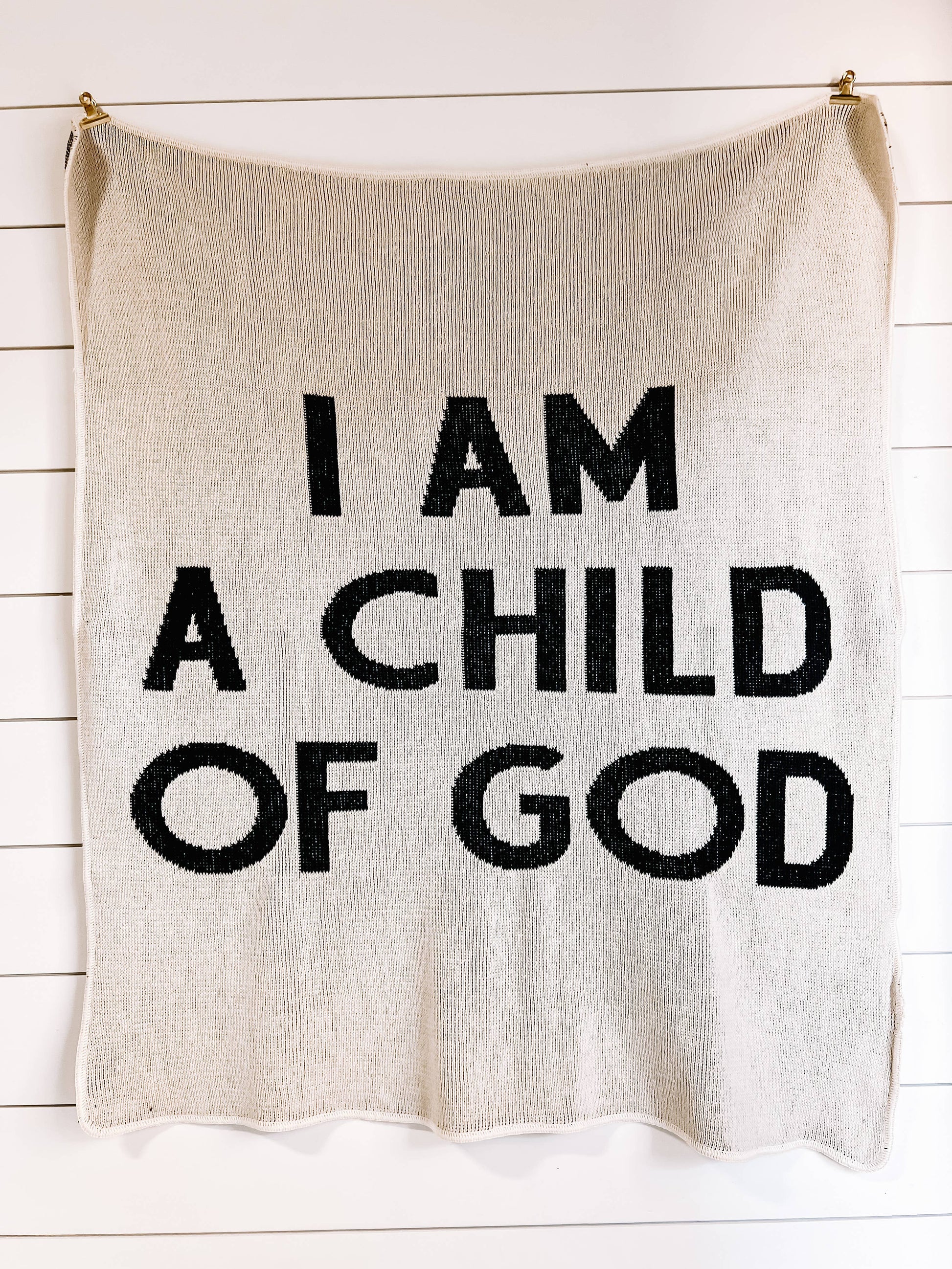 NEW Made in the USA throw blankets. Each blanket is made from a Recycled Cotton Blend and comes in 4 size options. Content: 80% Recycled Cotton 20% Polyester Care: Machine wash cold/gentle, Do not bleach, Tumble dry low/delicate Design: I AM A CHILD OF GOD