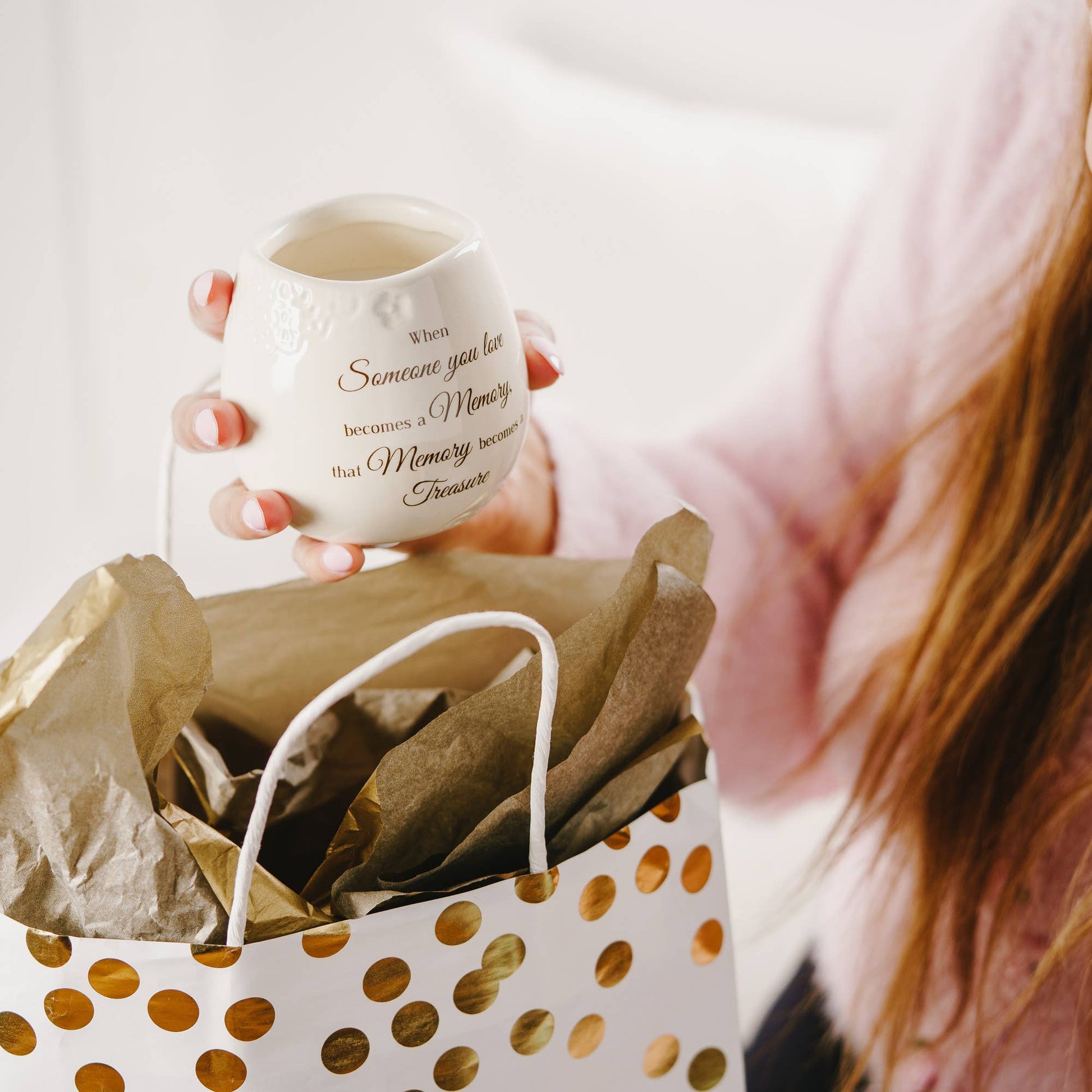 8oz candle holder, packaged securely in a printed box, is made from ceramic and features a 100% soy wax candle with a tranquility scent. . "When Someone You Love Becomes A Memory, That Memory Becomes A Treasure" text is printed onto the front of the candle holder. . Wipe clean only. Always take care around an open flame. Great for remembering a loved one who has passed.
