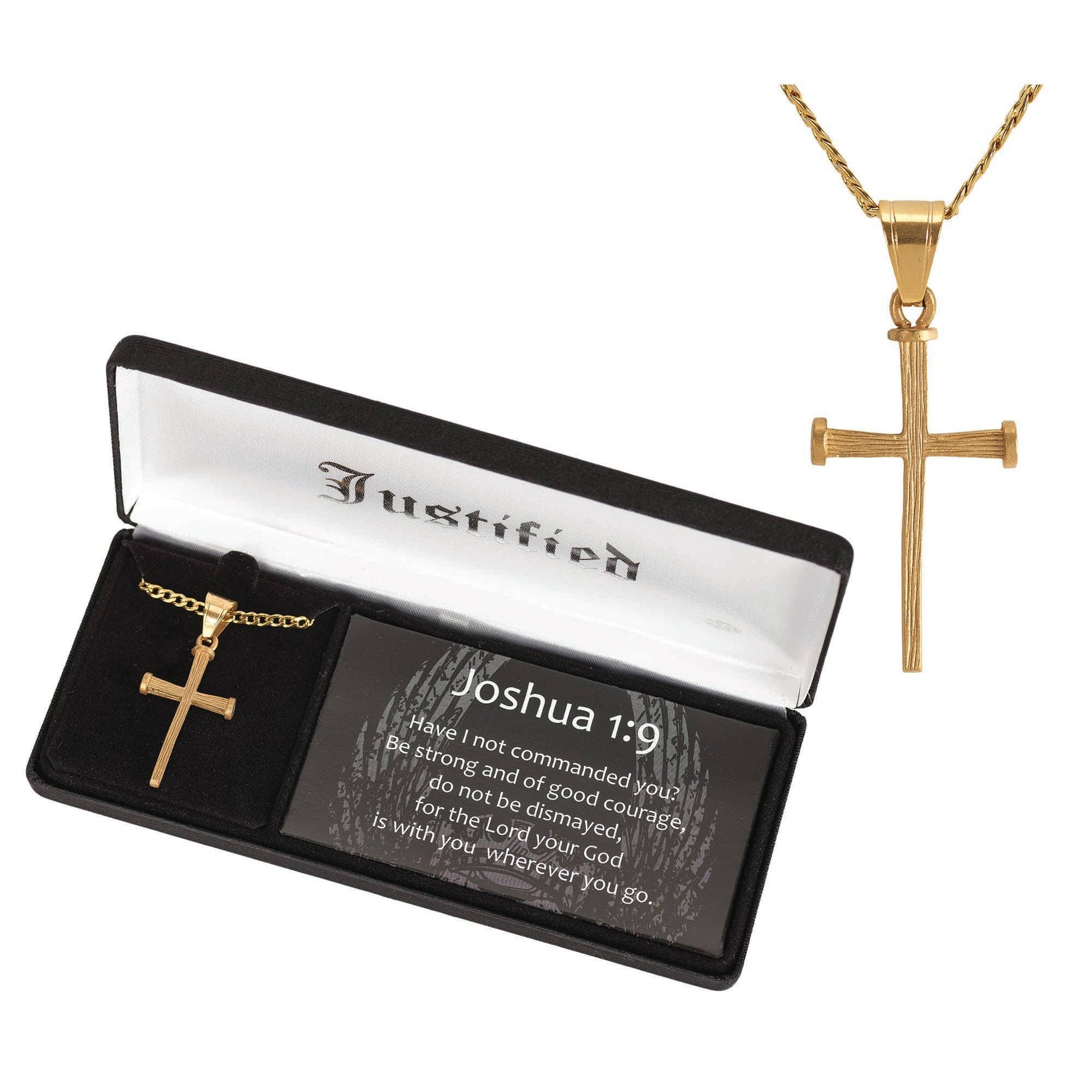 Men's Gold Tone Stainless Steel Nail Cross Necklace in Deluxe Gift Box with Joshua 1:9 Gold tone stainless steel nail cross has carved texture finish. Pendant is 1 1/4"L x 7/8"W with 3/8" bale on 24" gold tone curb chain. Comes in black fabric covered deluxe presentation gift box with attractive design and the words of Joshua 1:9, "Have I not commanded you? Be strong and of good courage, do not be dismayed, for the Lord your God is with you wherever you go."