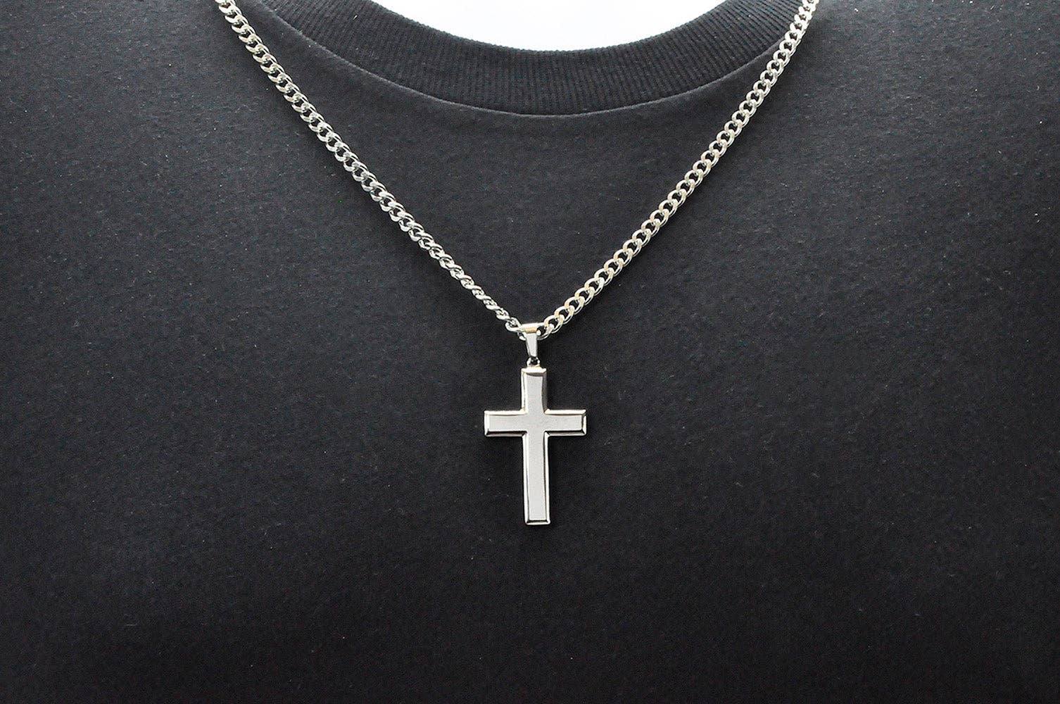 Mens Polished Stainless Steel Cross Pendant Necklace