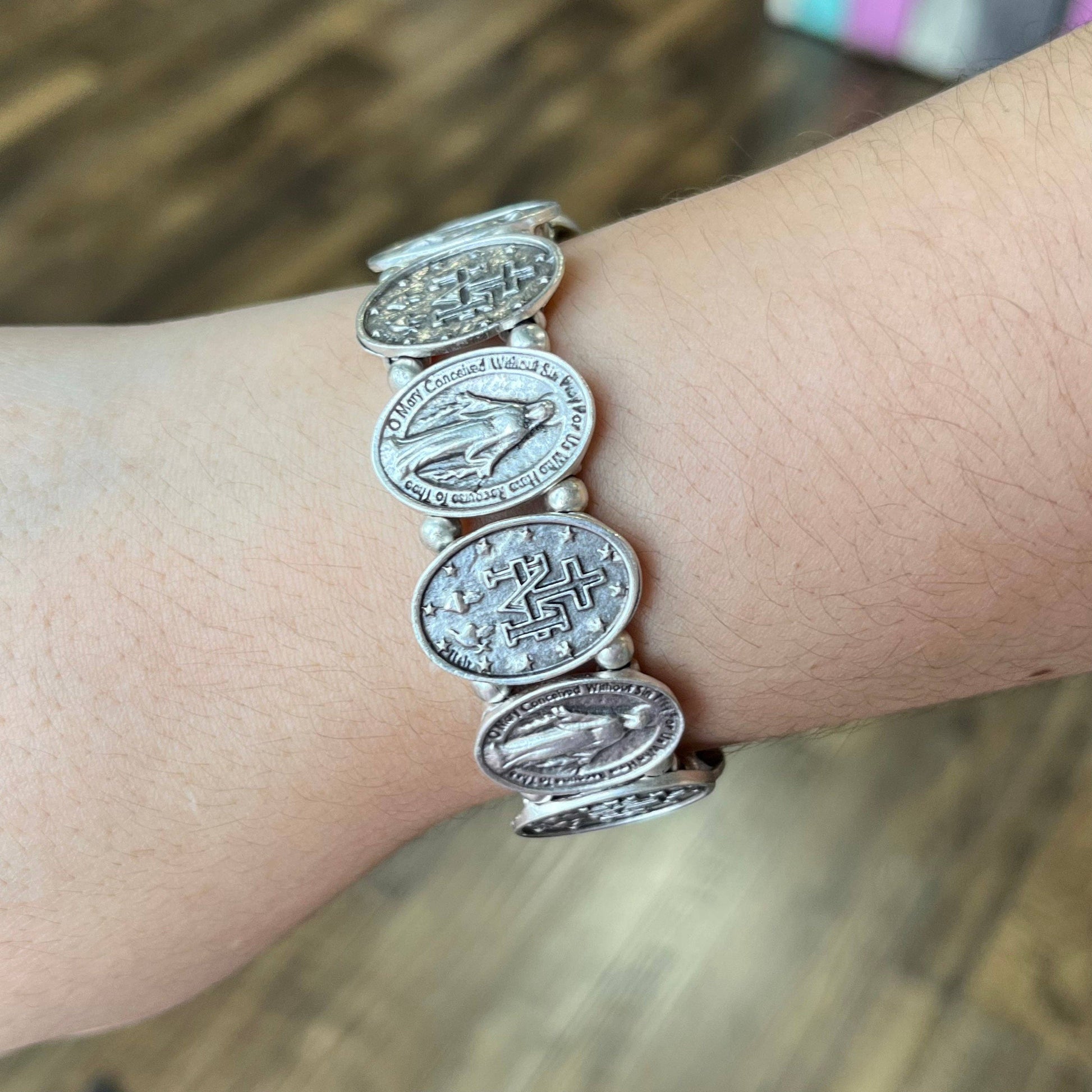 Stretchy Miraculous Medal Silver-Plated Turkish stretch Bracelet. Available in single or double sided medals! The single sided bracelet is about a 7” size and the double sided is about a 7.5” size.